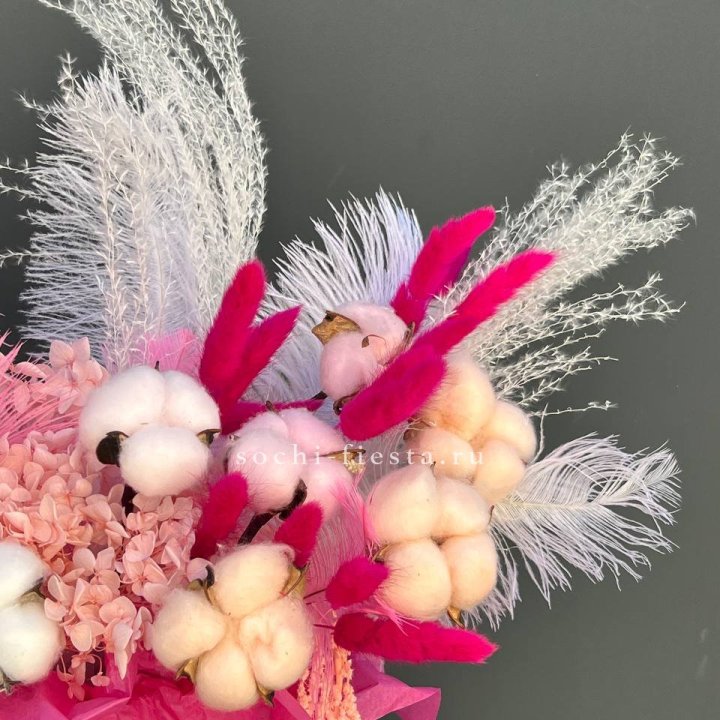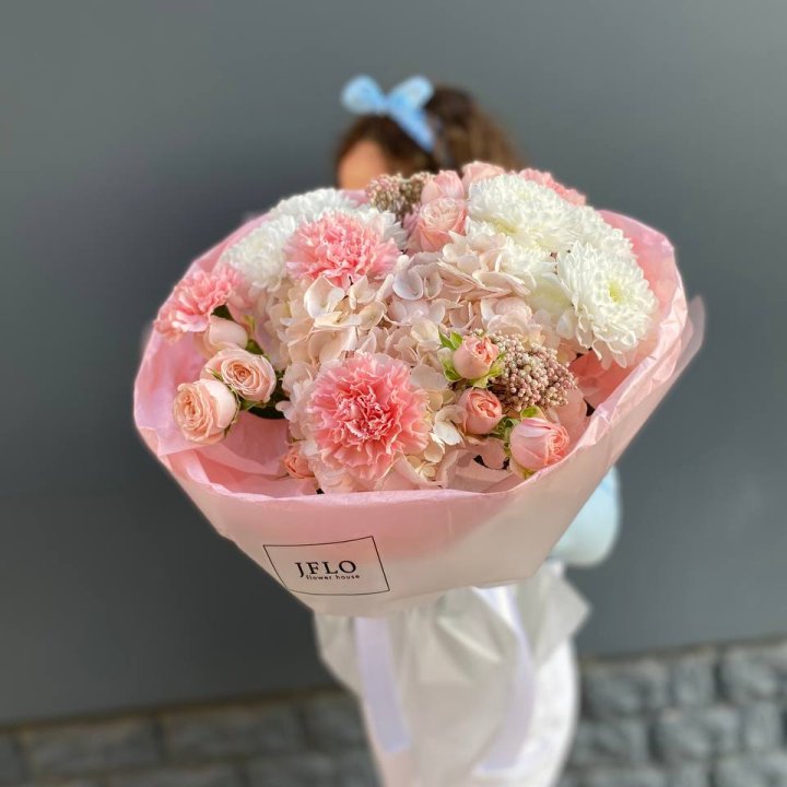Форматы — моно-букет, авторский микс, шляпная коробка, корзина с флористической губкой, композиция в стеклянной вазе. Размер, высота и плотность композиции подбираются под повод и габариты получателя.