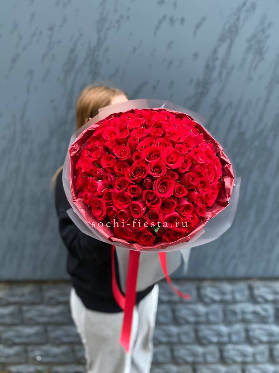 Сто одна кенийская роза в едином цилиндре — это впечатляющий масштаб и безупречная симметрия. Плотный силуэт и насыщенный цвет создают мощное визуальное присутствие. Композиция звучит сама за себя.