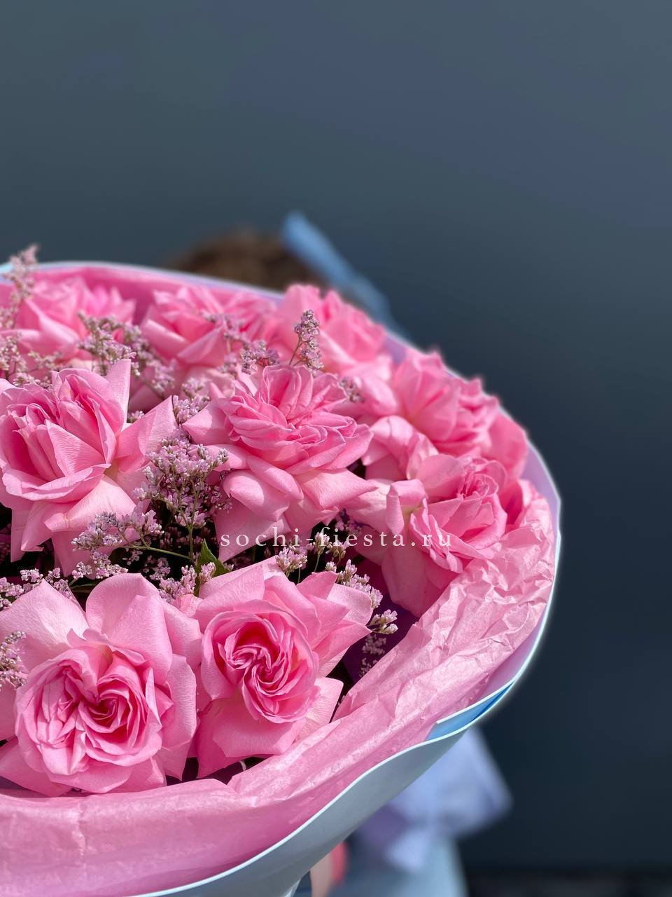 французские розовые розы., лимониум, эвкалипт, лента, дизайнерская пленка. На фото представлен букет из 11 роз.