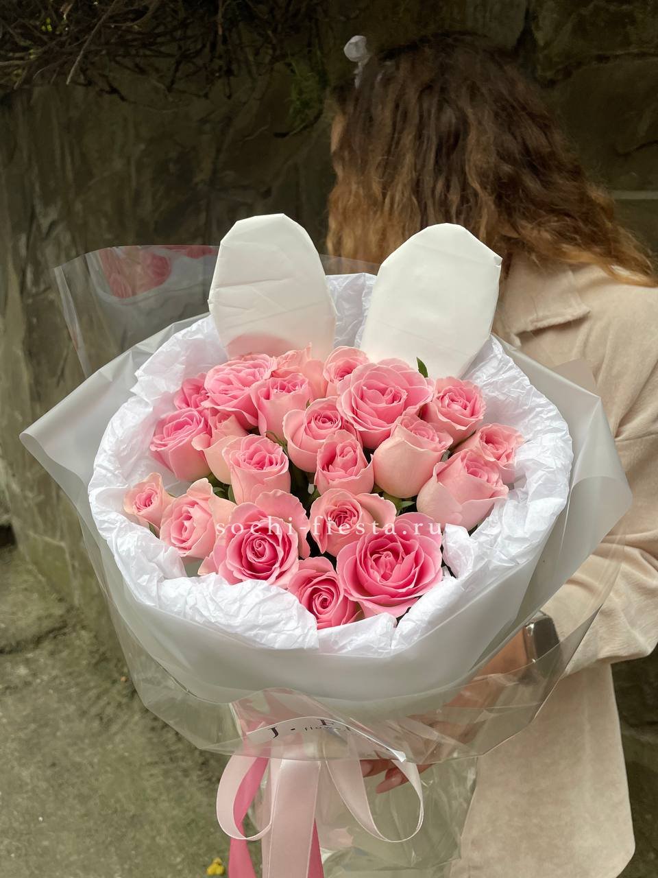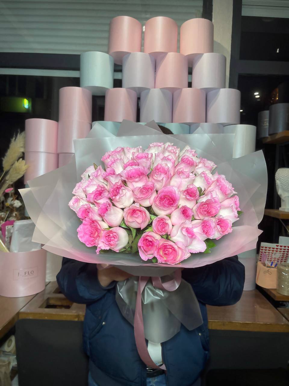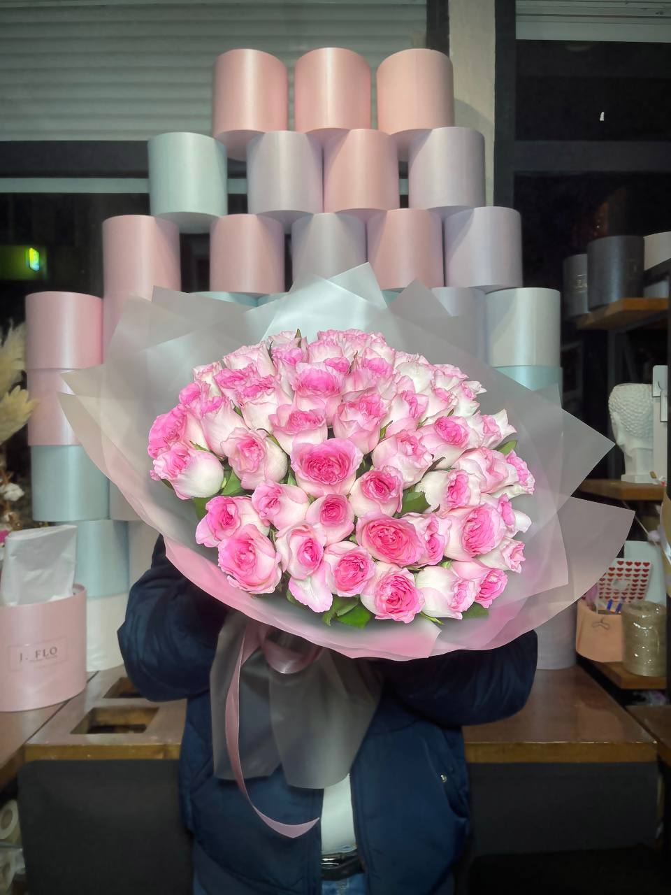 Одиннадцать кустовых роз с густыми многолепестковыми бутонами в нежно-розовой гамме. Каждая ветка раскрывается несколькими головками, создавая пышную объемную форму. Для тех, кто любит выразительные букеты с характером.