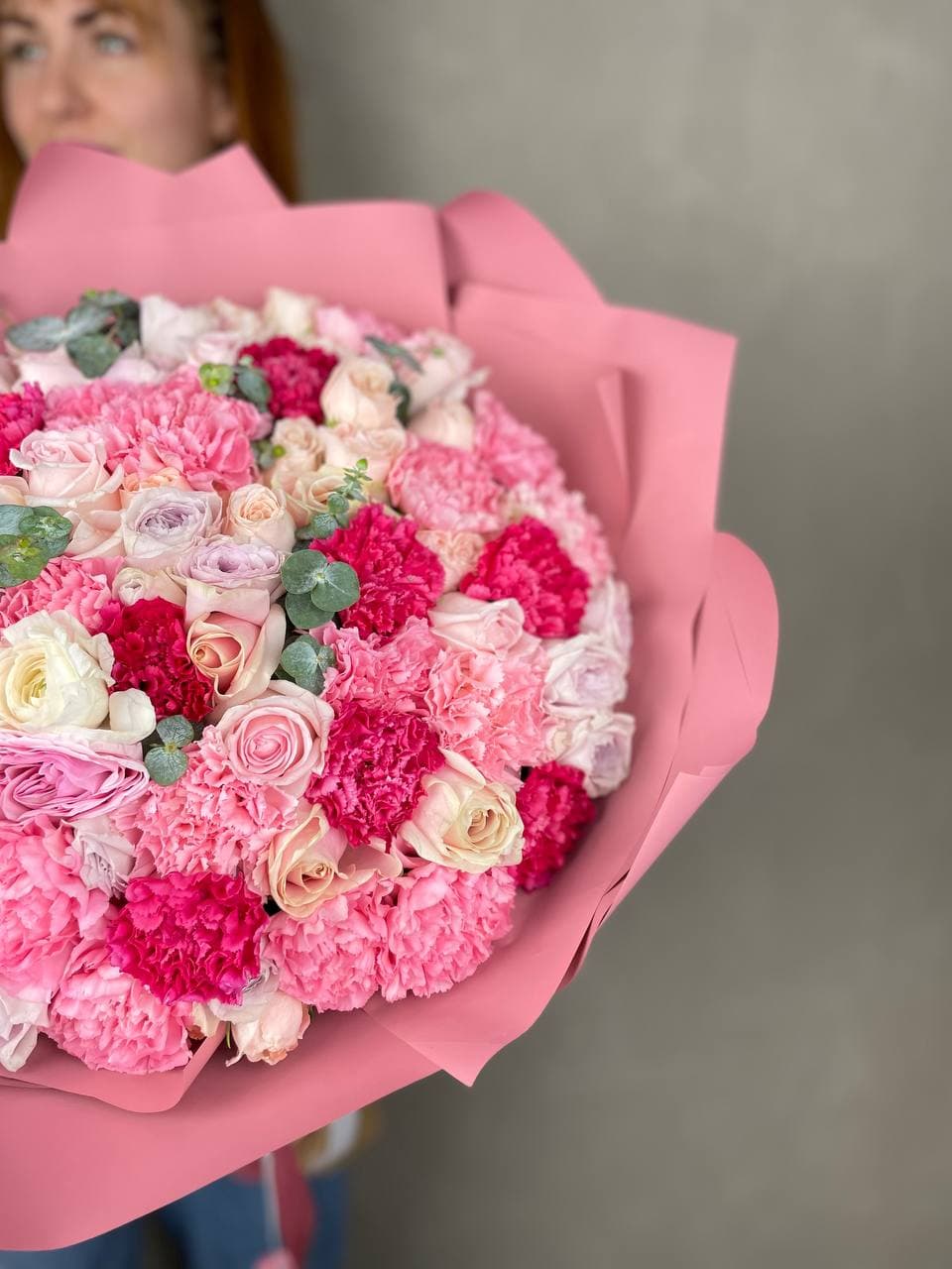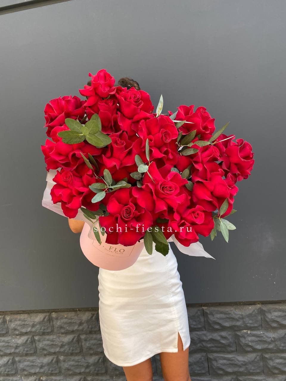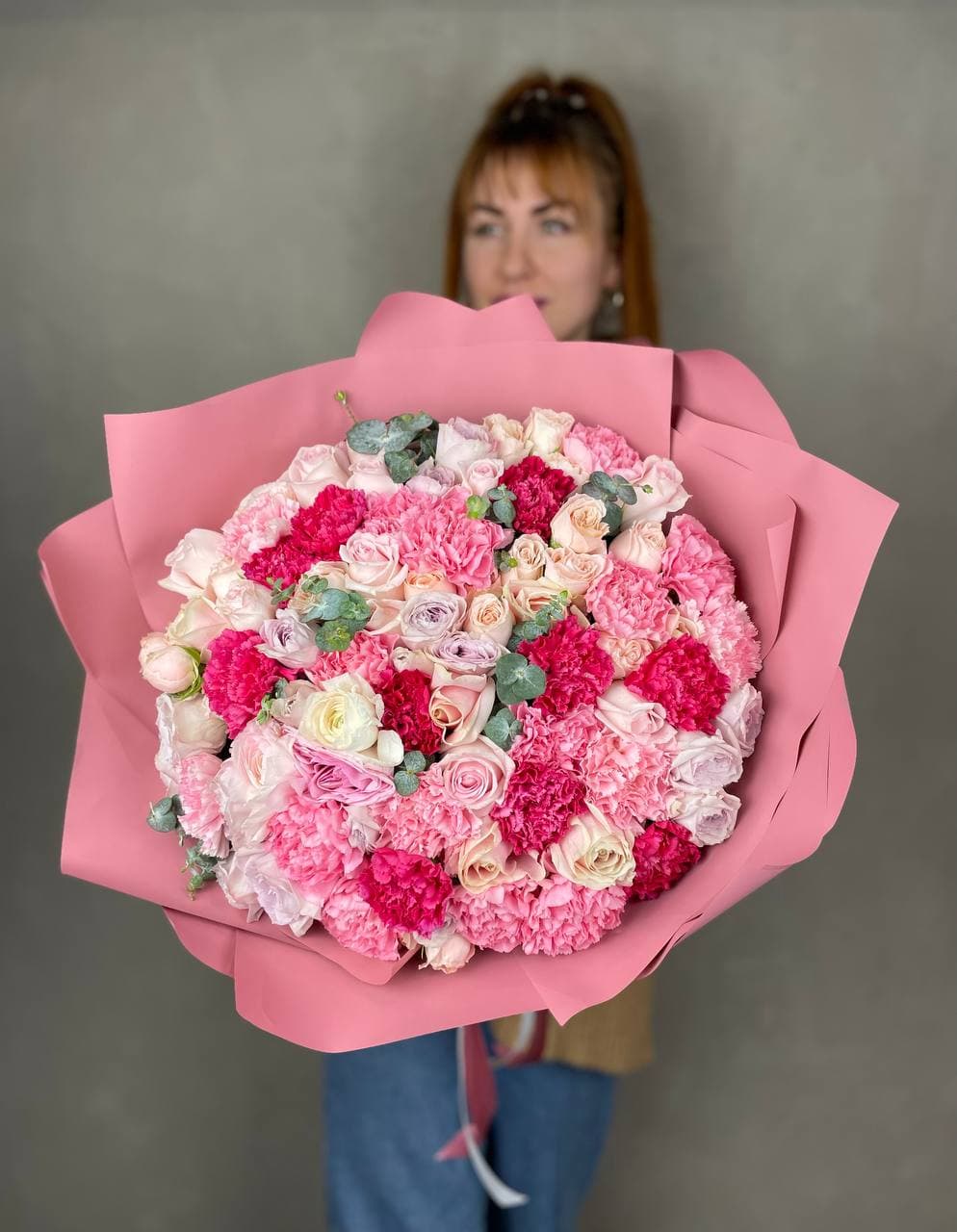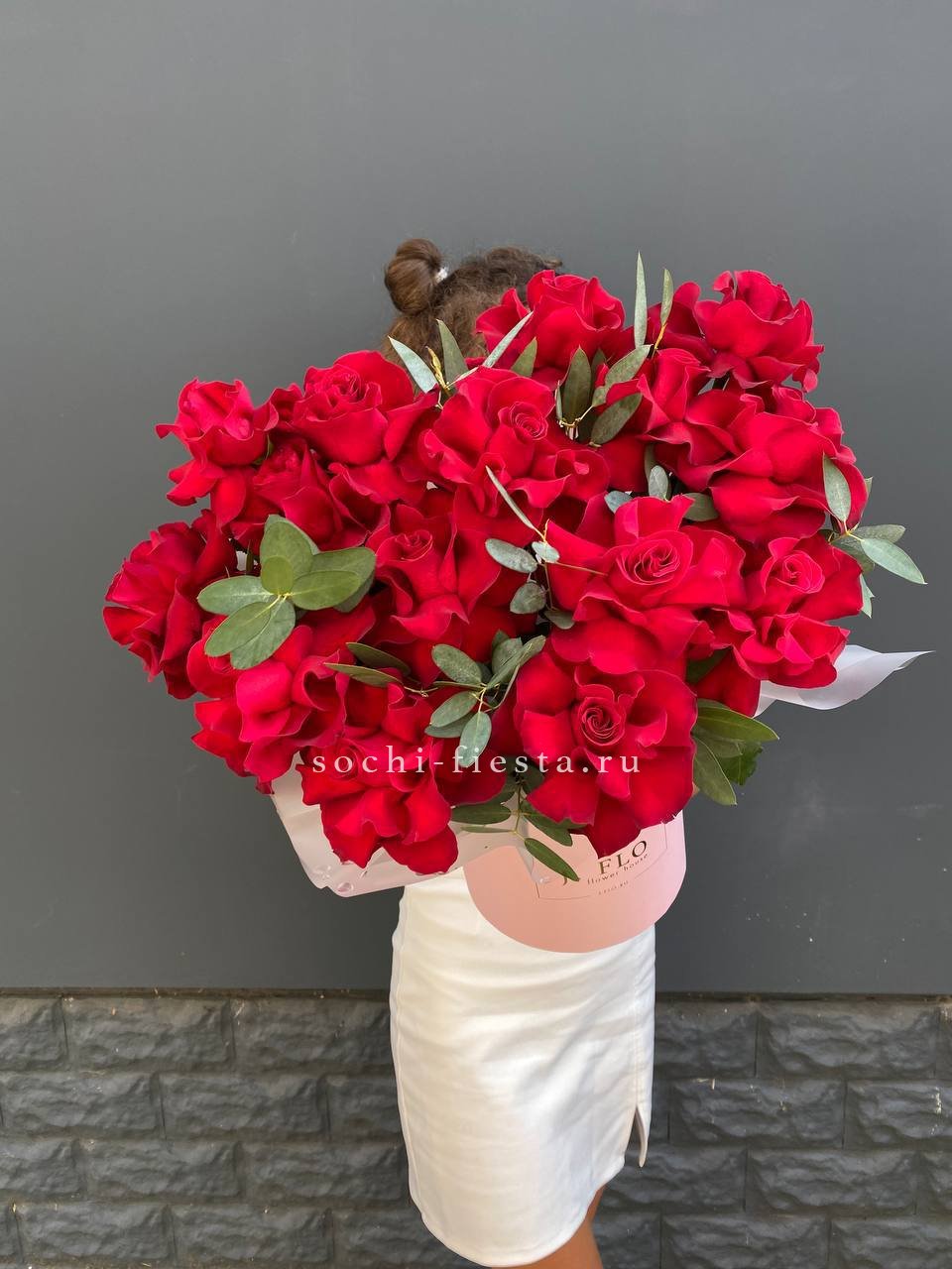 Пятнадцать вывернутых роз Джумилия раскрывают свою многослойную структуру в каждом бутоне. Эвкалипт обрамляет композицию, подчёркивая фактуру лепестков.