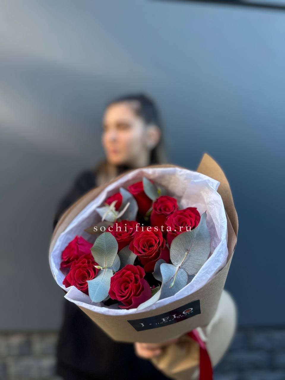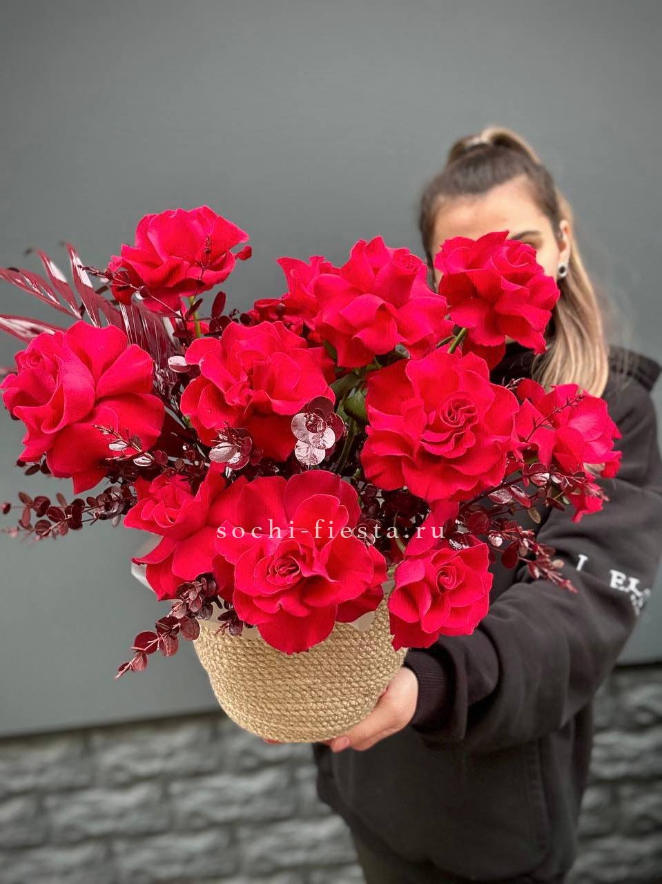 Тридцать один бутон Джумилии собран в плотную композицию с графичным силуэтом. Лепестки раскрываются слоями, создавая объёмную текстуру в цилиндре. Эвкалипт добавляет вертикальный ритм и завершает форму.