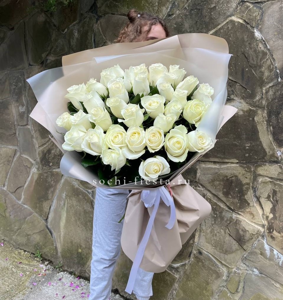 Тридцать пять белых роз образуют объемную композицию с выразительным силуэтом. Светлая упаковка поддерживает воздушность и графичность линий.