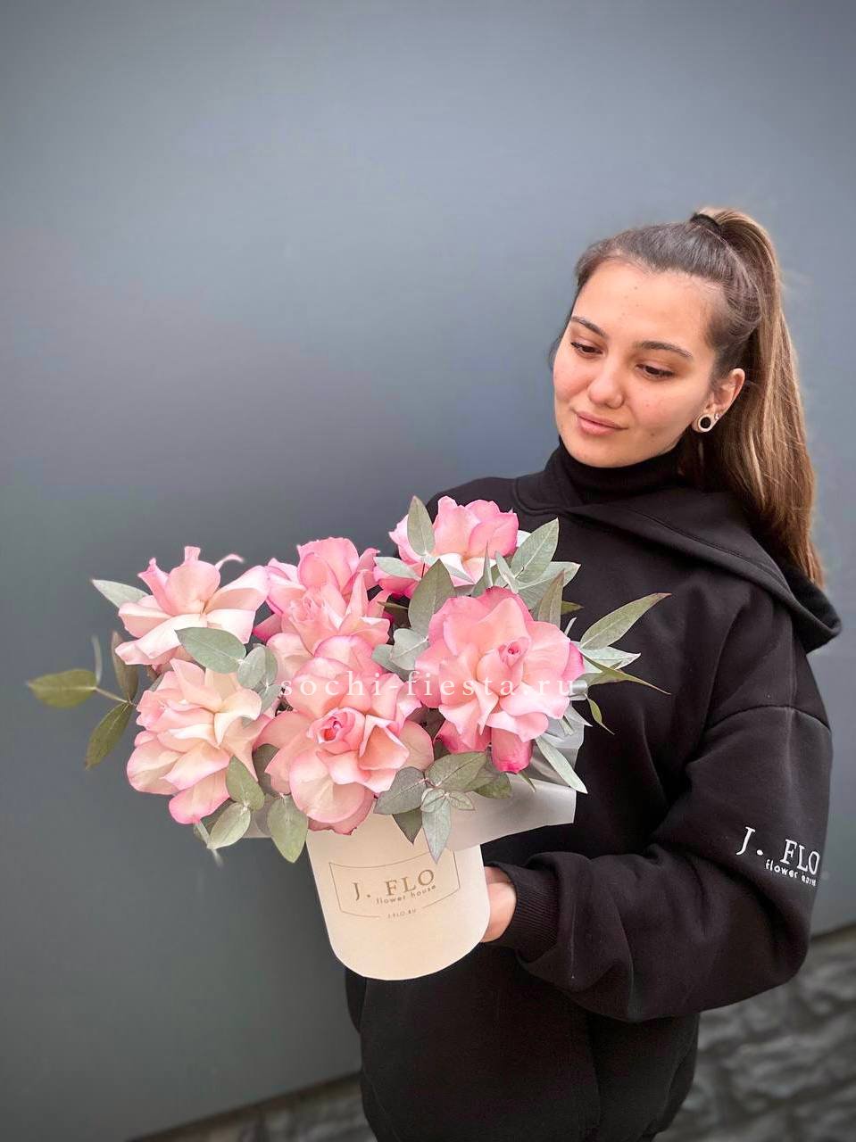 Семь вывернутых роз раскрывают лепестки наружу и создают объемную текстуру. Эвкалипт обрамляет бутоны и придает композиции свежесть.