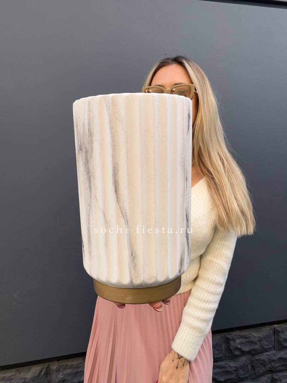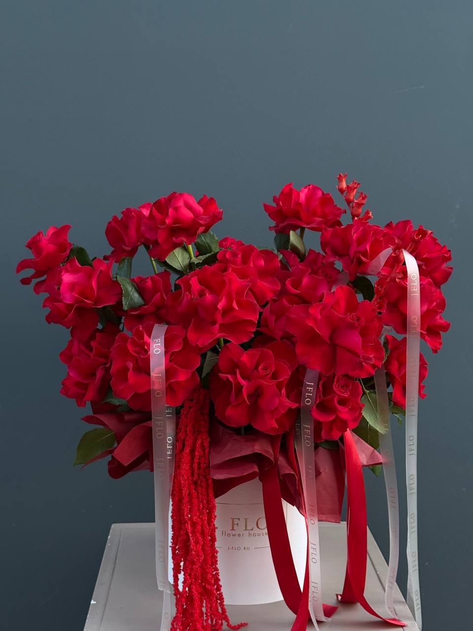 вывернутые розы, цилиндр D13, эвкалипт, лента, упаковка.