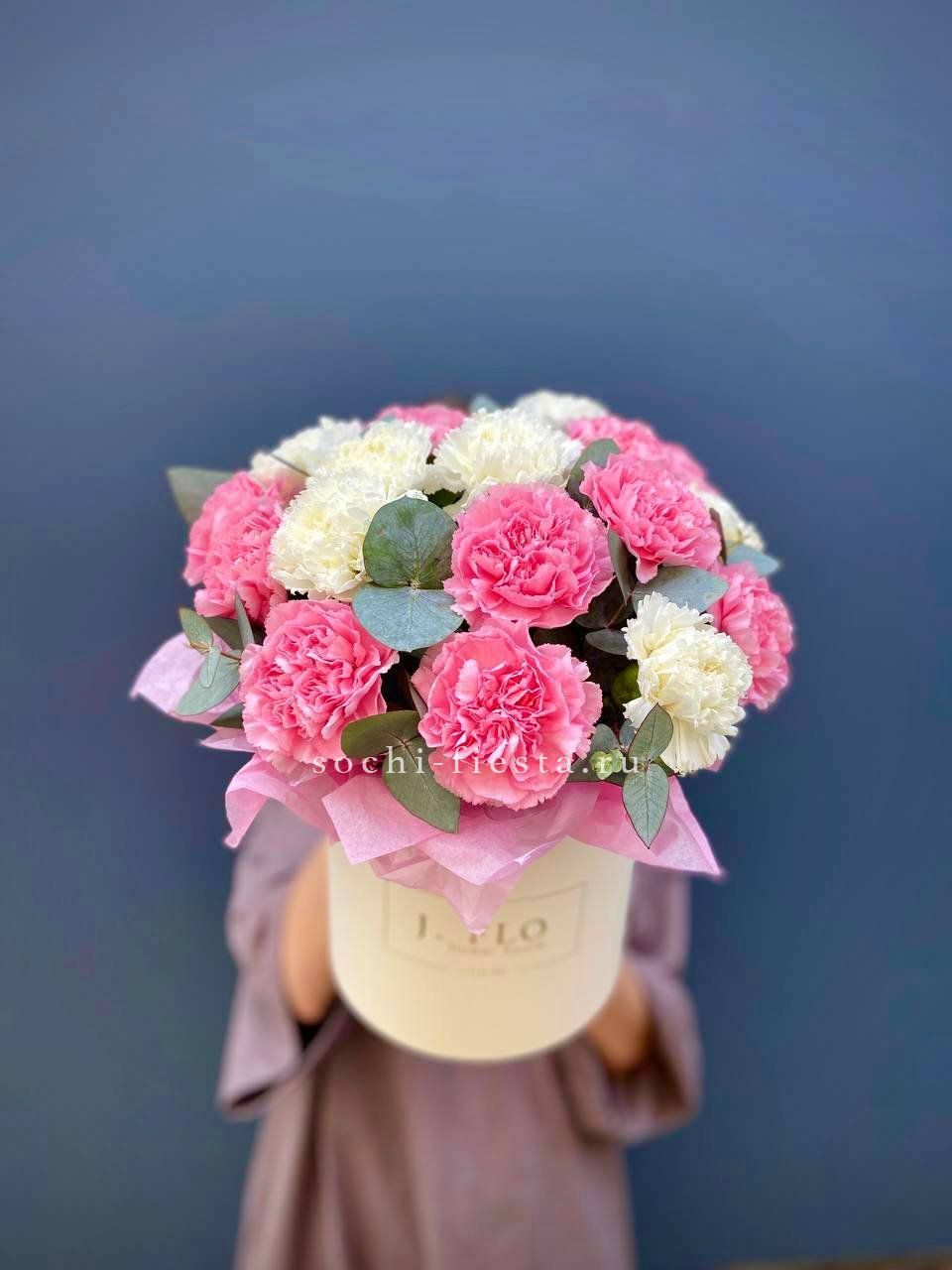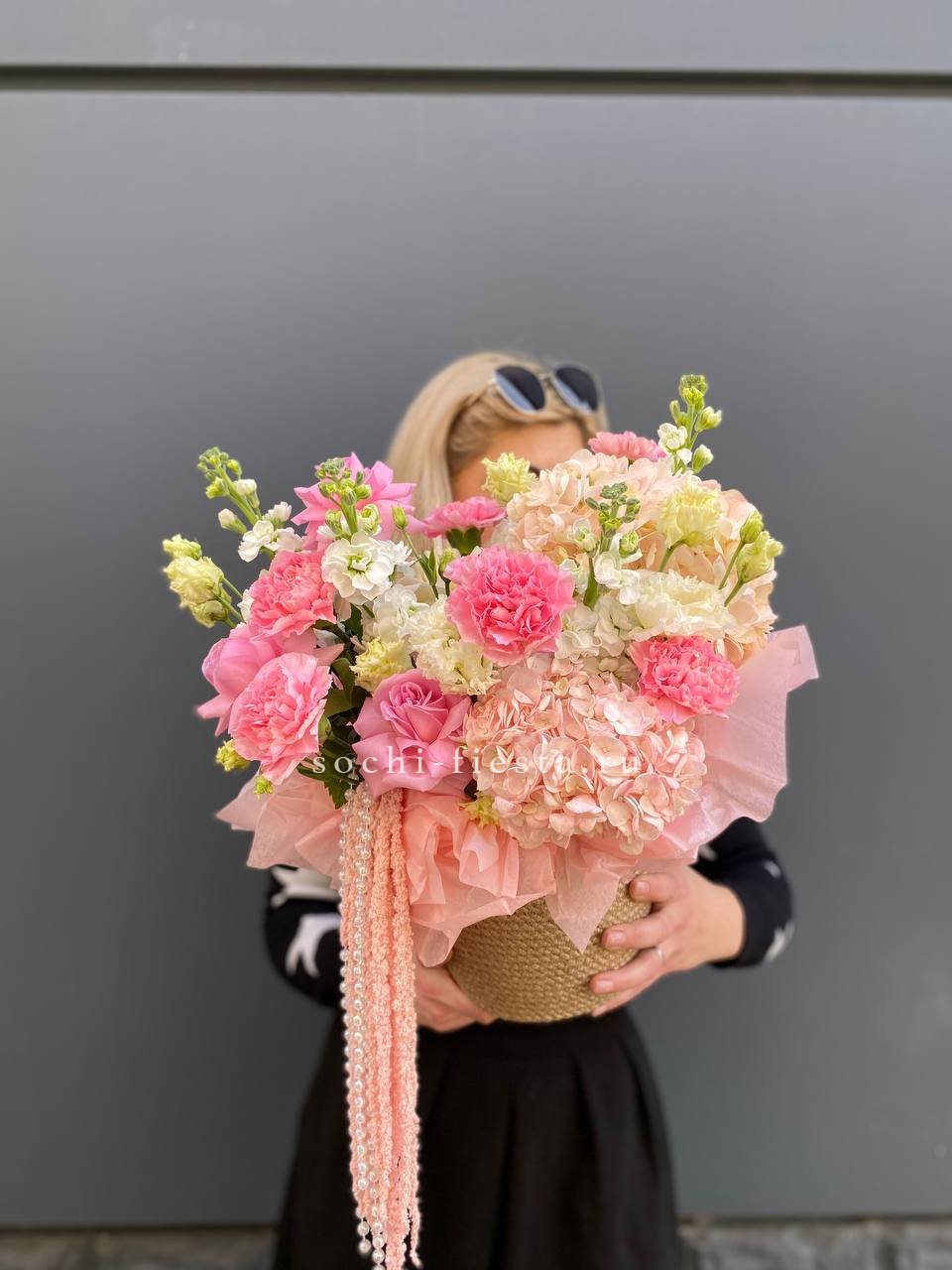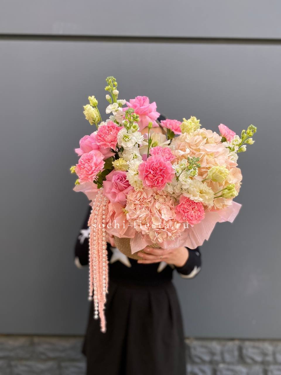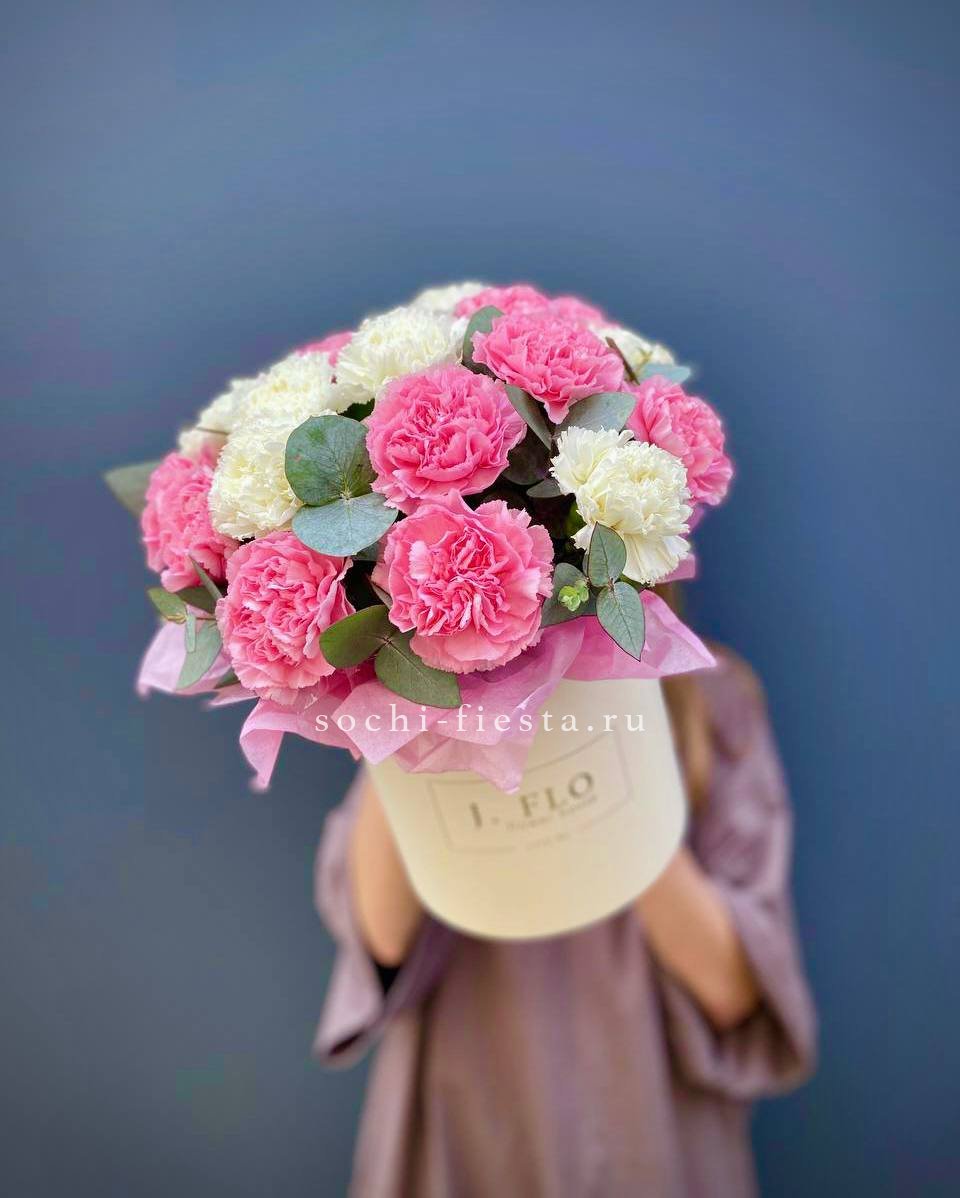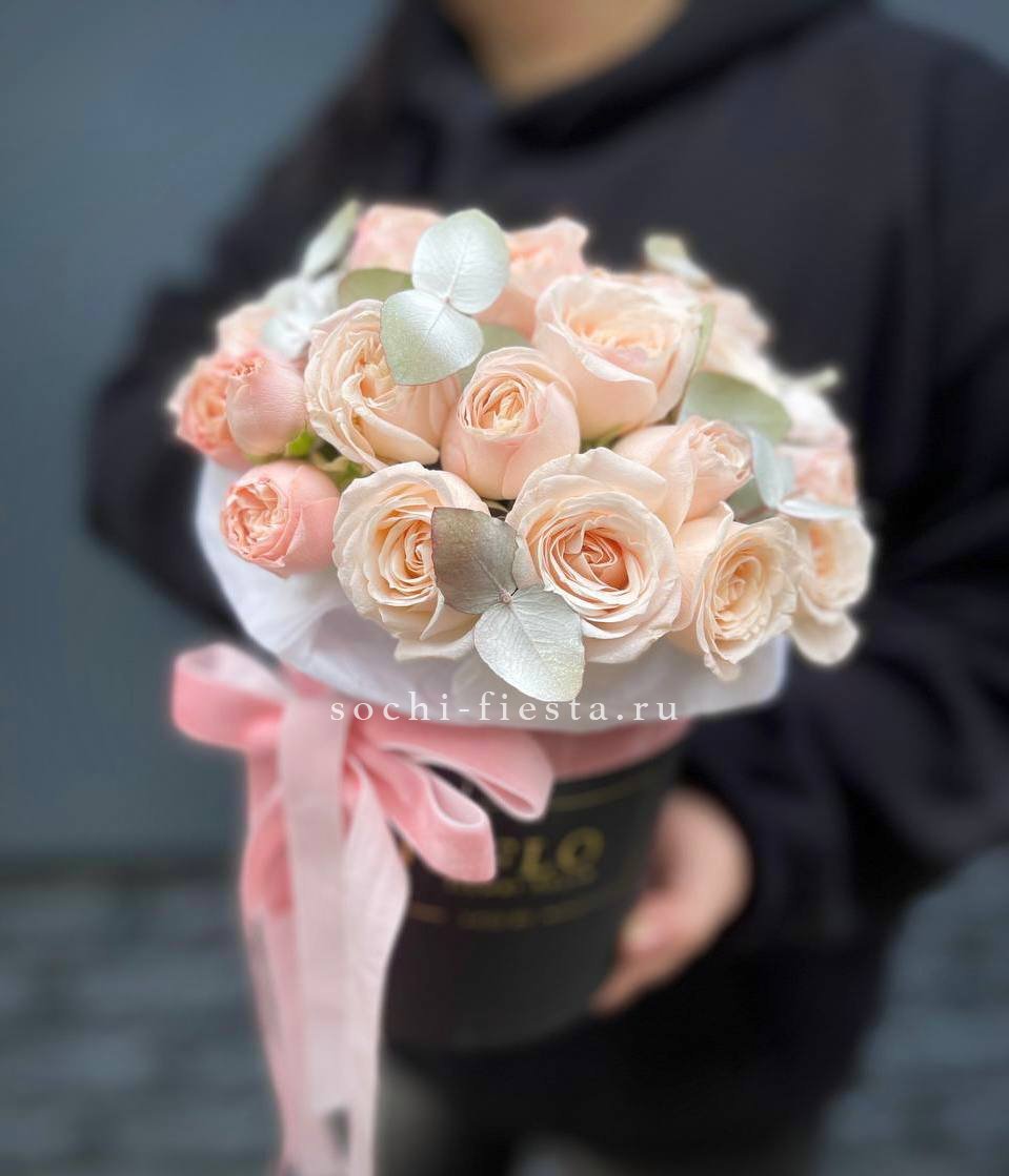 гортензия, вывернутые розы, диантус, кустовая роза, диантусы, оформление в боксе.