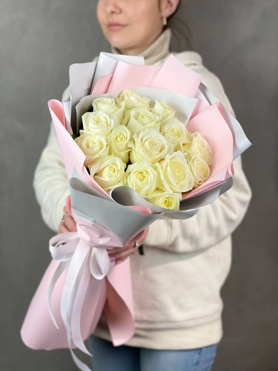 Пятнадцать белых роз в дизайнерской бумаге создают мягкий графичный силуэт. Бутоны собраны плотно с сохранением естественного ритма и воздуха между ними.