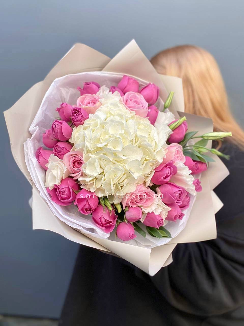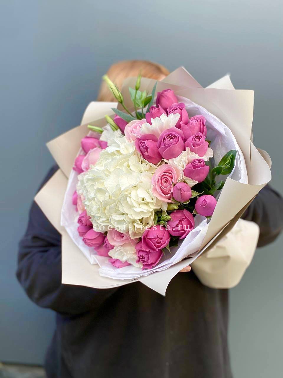 гортензия, роза белая, лента, дизайнерская пленка.