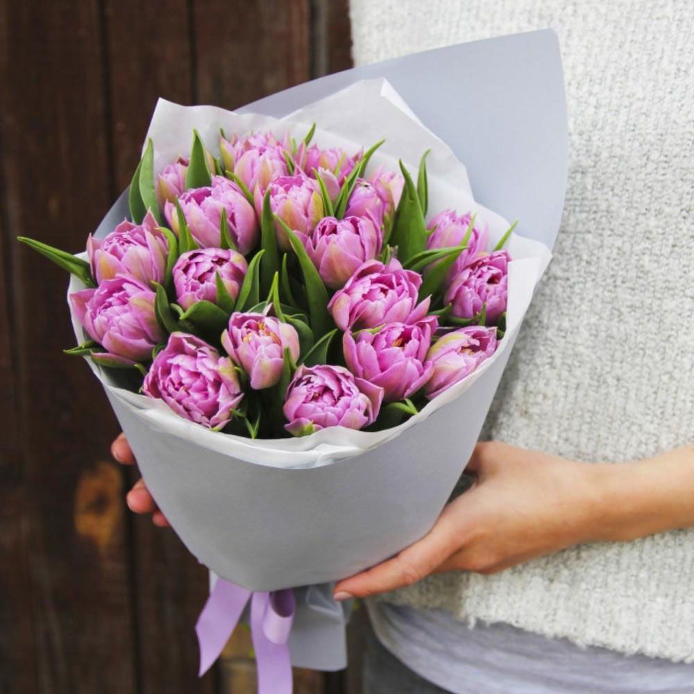 пионовидные тюльпаны 19 шт., лента, дизайнерская бумага.