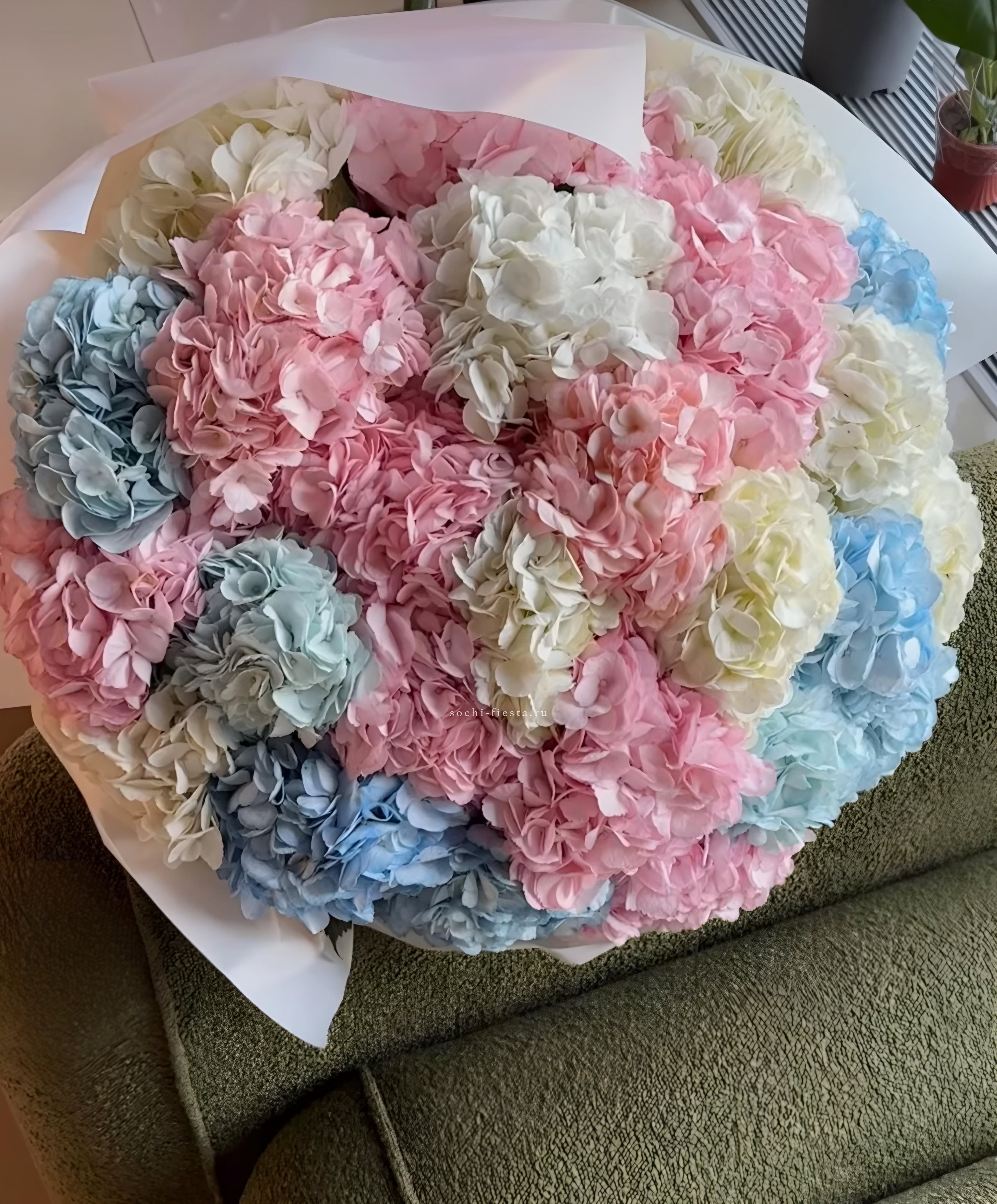 Пышная гортензия соседствует с крупными бутонами роз и многослойной эустомой. Веточки эвкалипта придают свежесть всей композиции. Букет с выразительным объемом и природной гармонией форм.