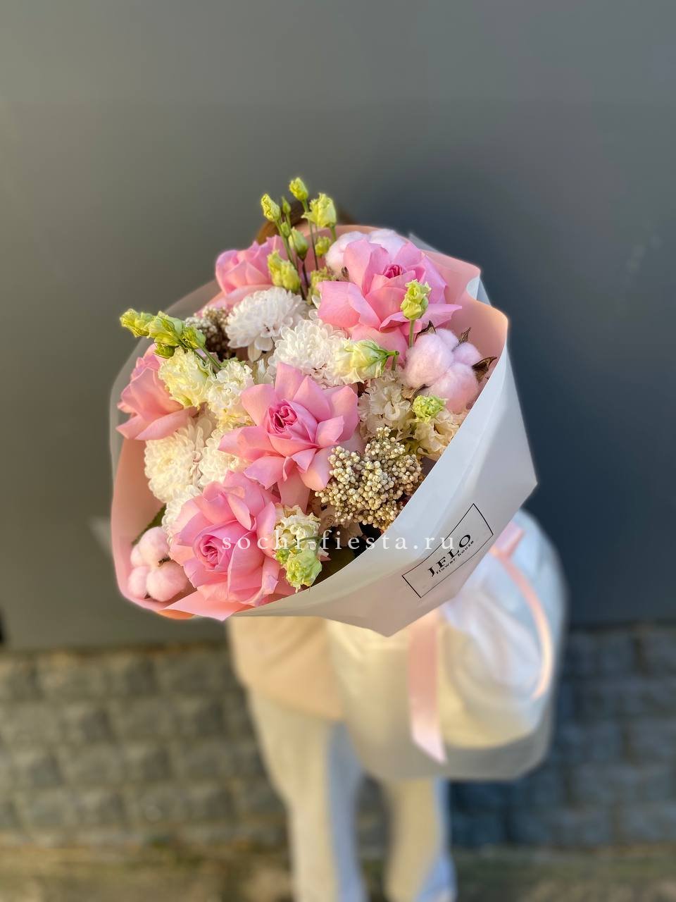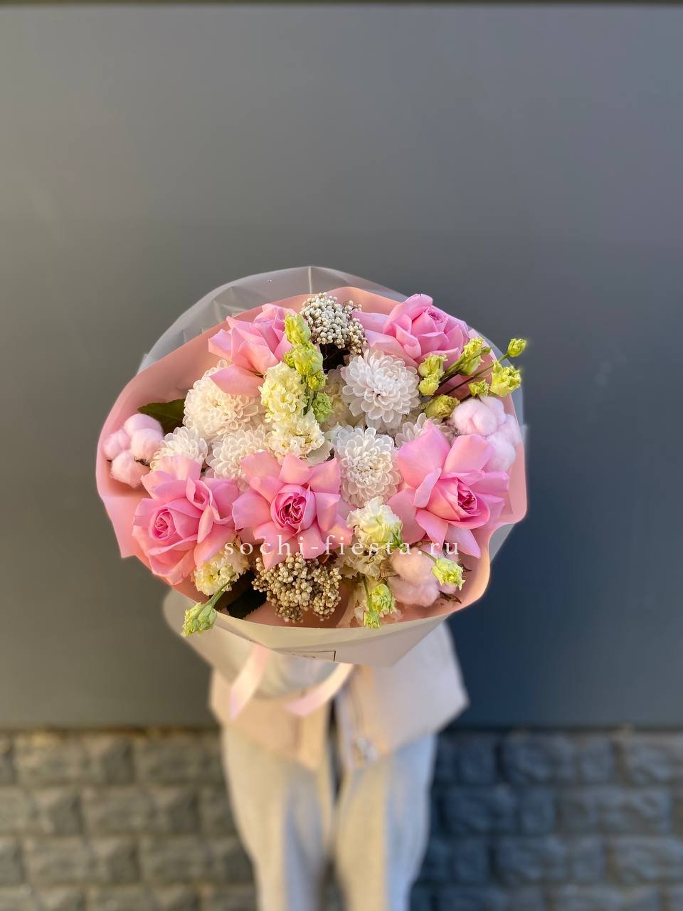 Розовые оттенки роз и эустомы переплетаются с яркой хризантемой в теплой композиции. Хлопок добавляет текстурной мягкости, а озотамус создает ажурную основу. Букет дарит радостное настроение и естественную красоту.