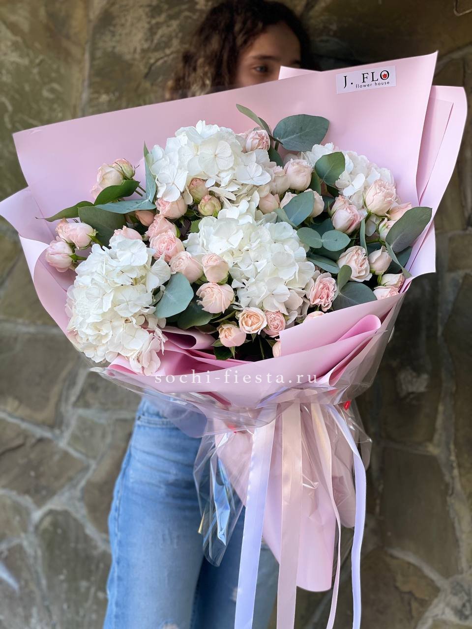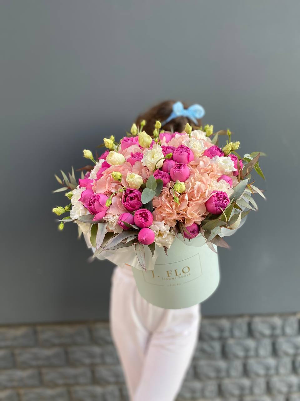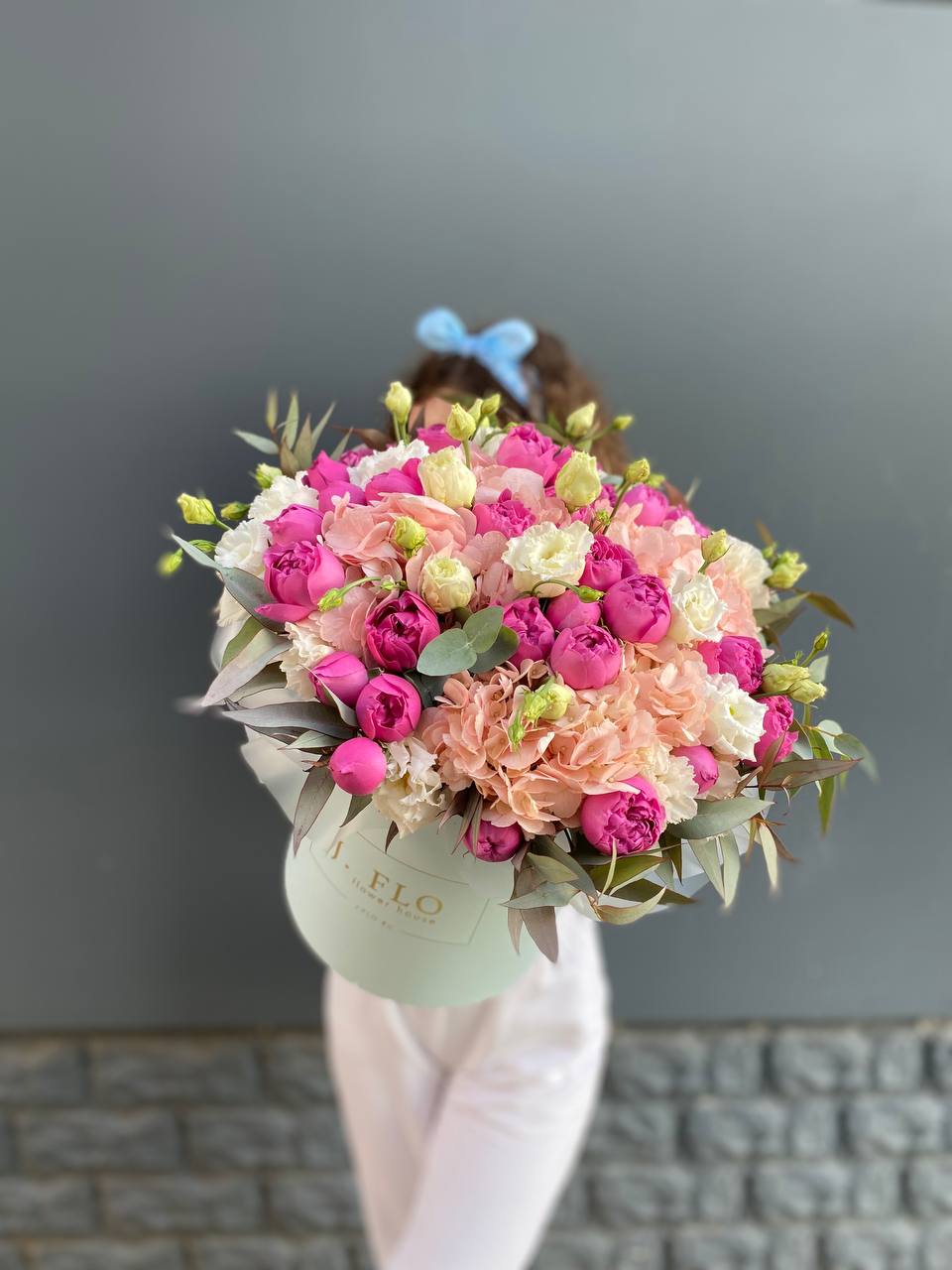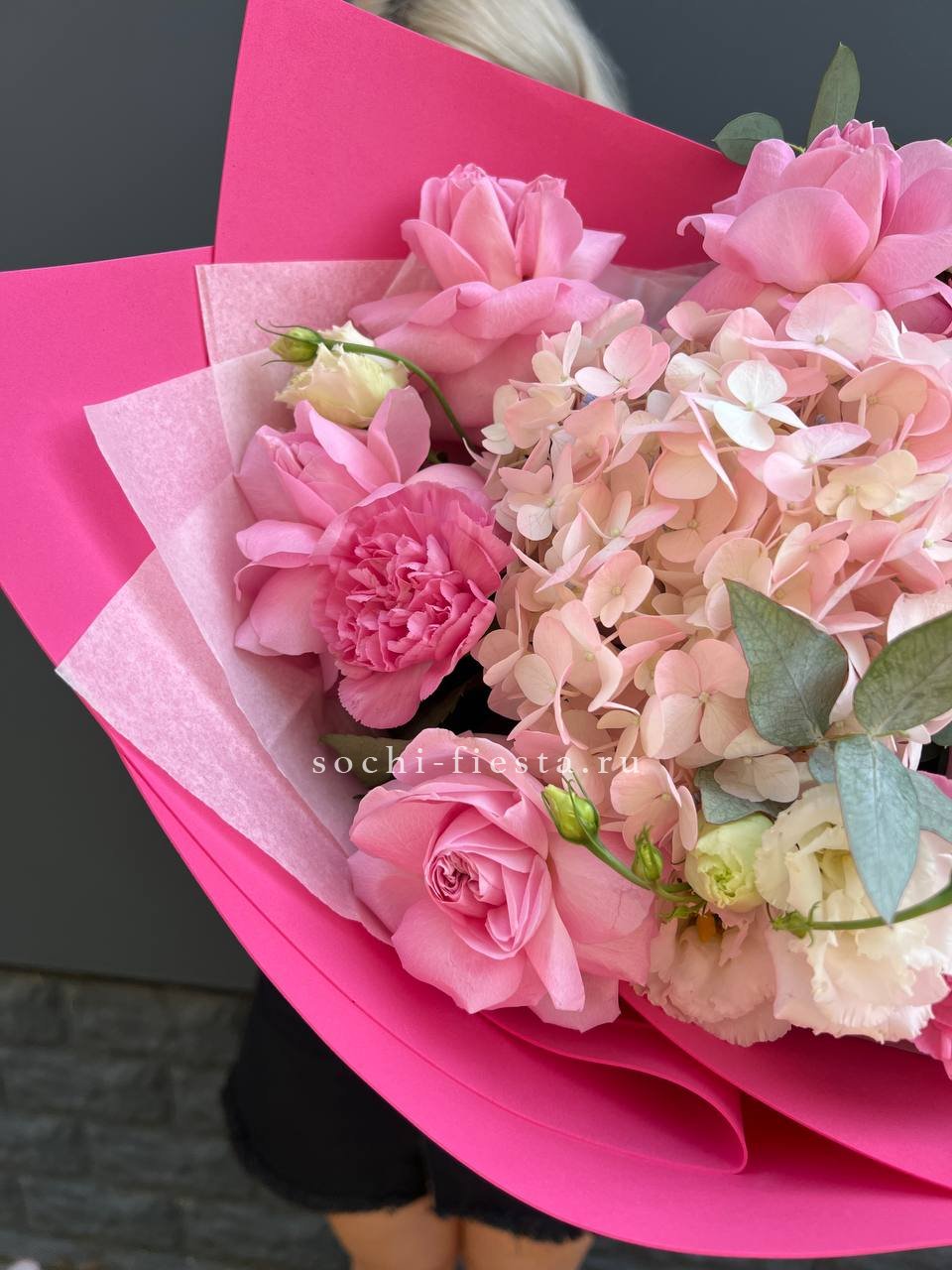 Розовая гортензия и эустома раскрывают свою красоту в каждом лепестке. Мягкие оттенки переходят один в другой, создавая спокойное и гармоничное впечатление.
