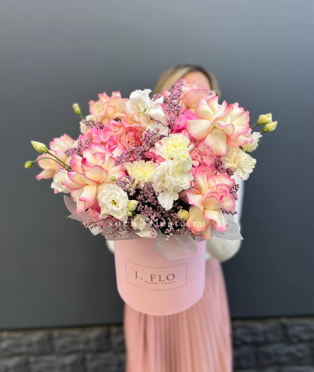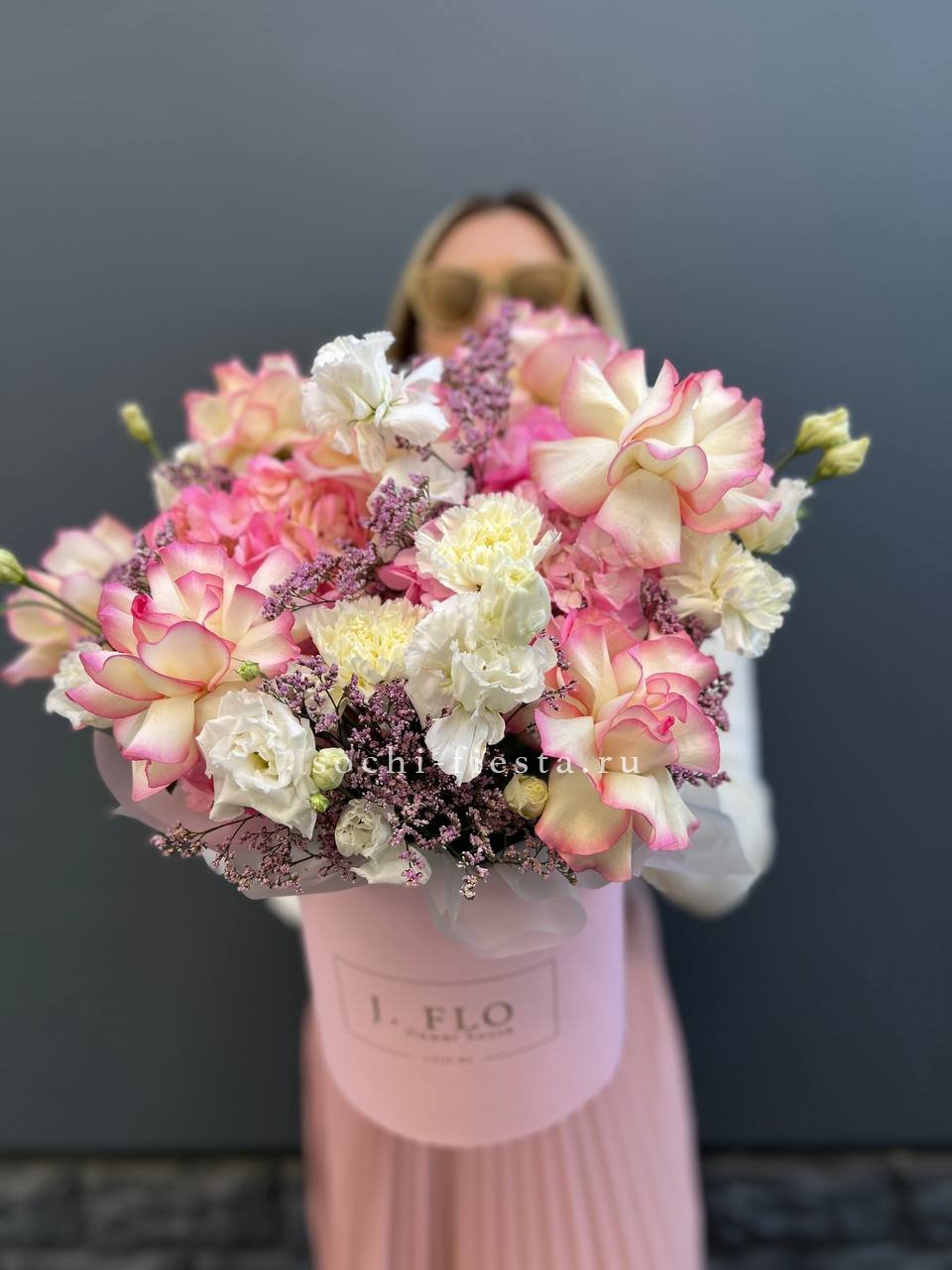 гортензия, эустома, диантусы, французские розы, эвкалипт, цилиндр D20.
