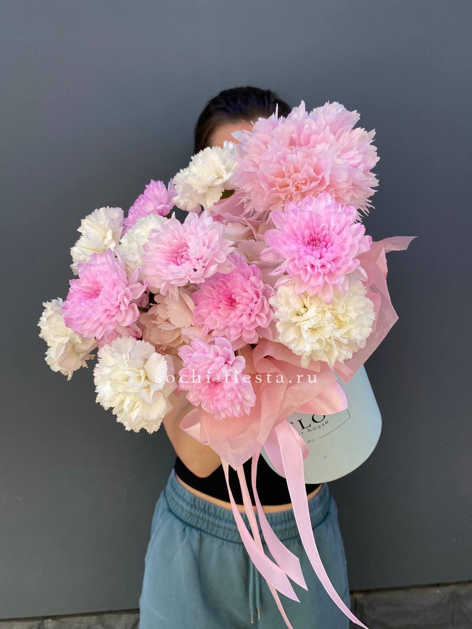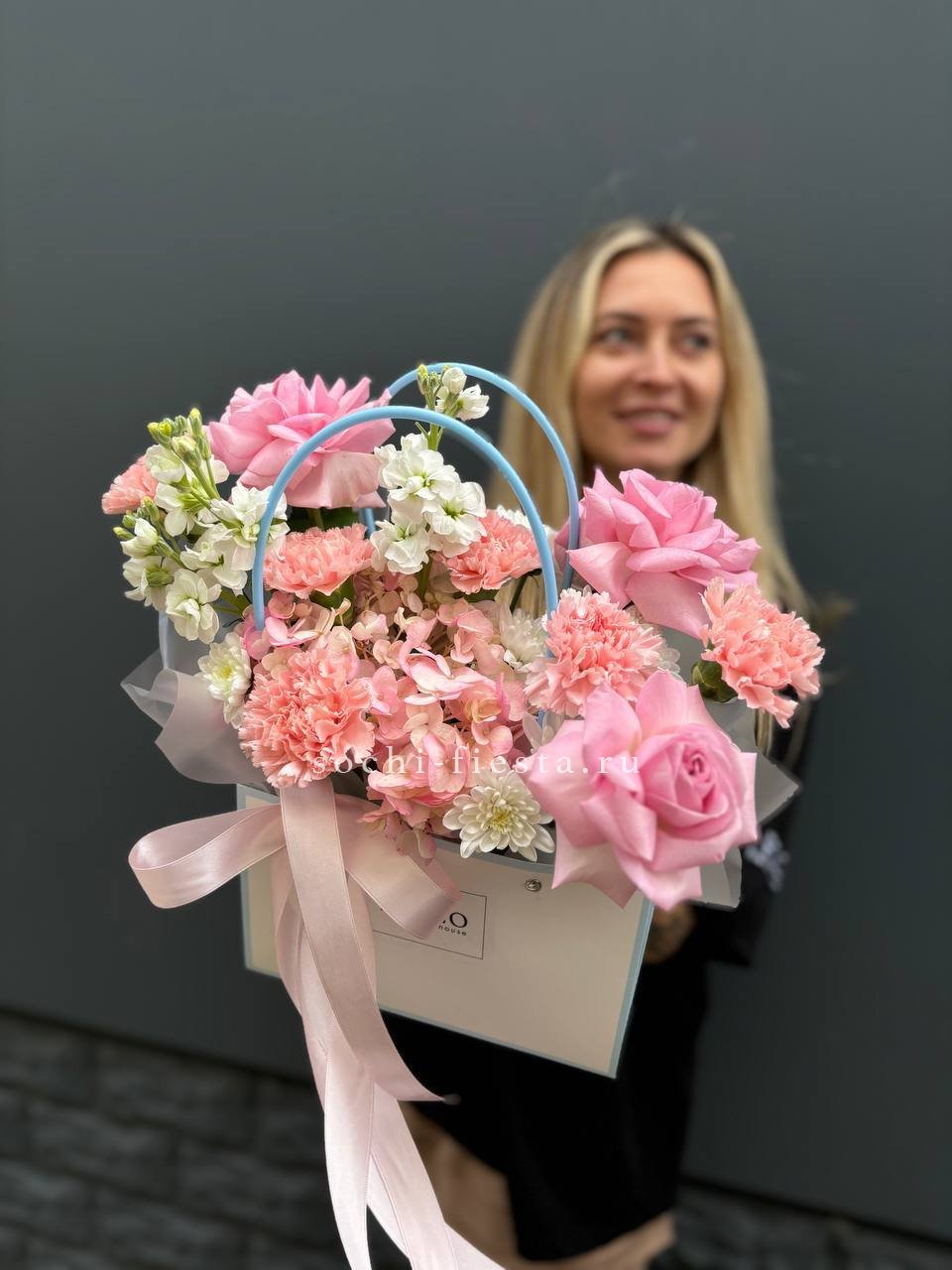 Пышная гортензия задает объем, а французские розы и эустома создают многослойную глубину. Диантусы добавляют графичные точки, эвкалипт обрамляет композицию мягкими линиями.