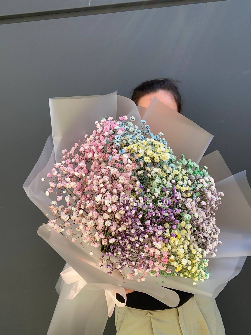 Семь веточек гипсофилы в радужной палитре собраны в компактную форму. Яркие переливы оттенков наполняют пространство живой энергией.