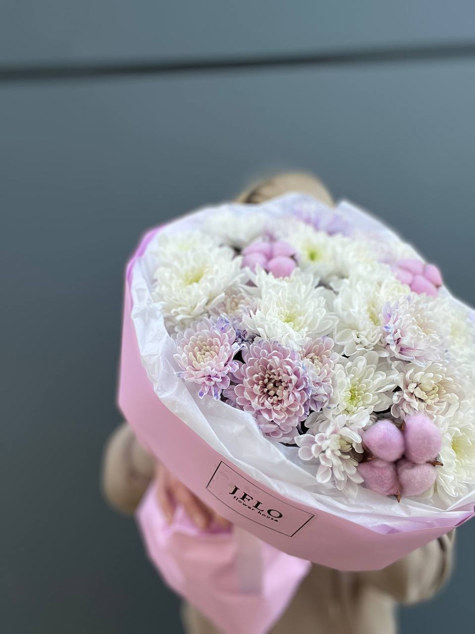 Семь пышных хризантем с коробочками хлопка собраны в мягкую композицию пастельных оттенков. Воздушная сборка и естественные линии создают ощущение легкости. Букет для тихих встреч и теплых слов.