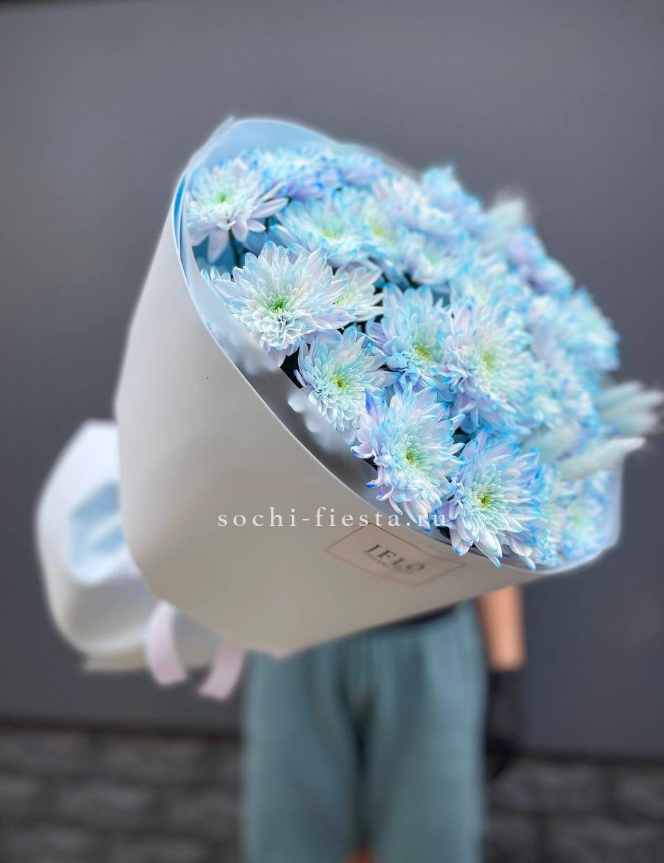 Девять кустовых хризантем собраны в плотный круглый силуэт. Каждая ветка раскрывается веером мелких соцветий, создавая объёмную текстуру. Букет держит форму и выглядит графично.
