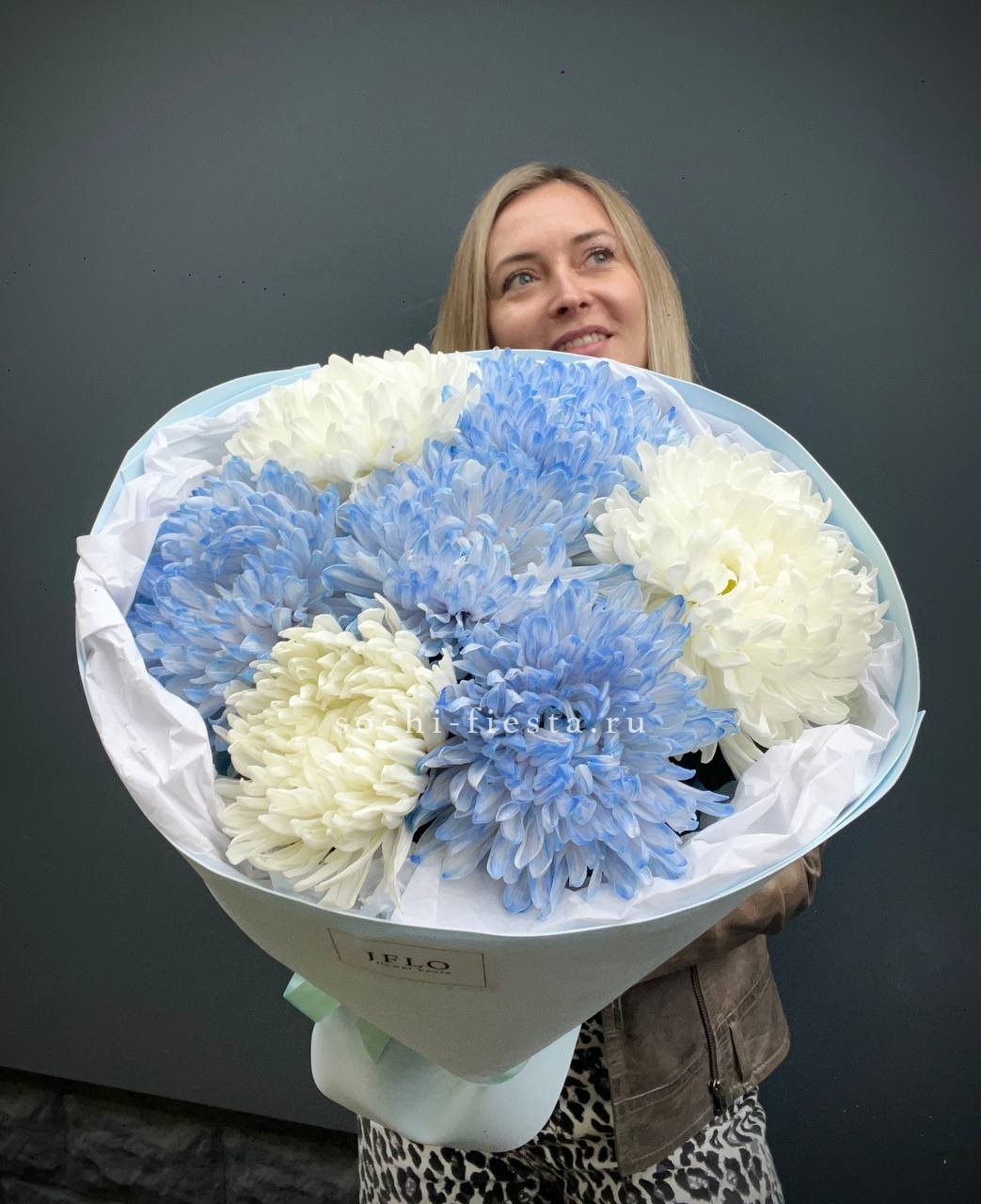 Семь крупных хризантем с открытыми бутонами в дизайнерской упаковке. Букет выглядит свежо и современно, легко вписывается в любое пространство.