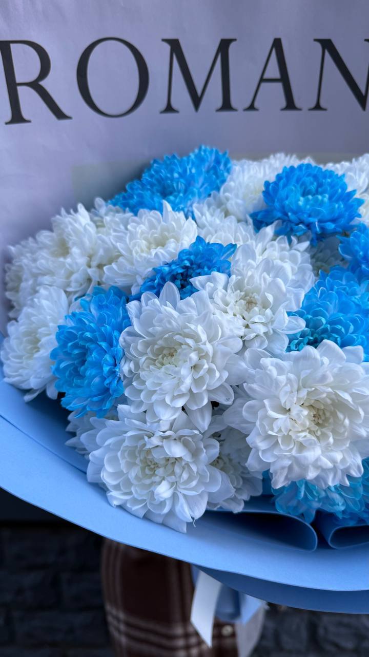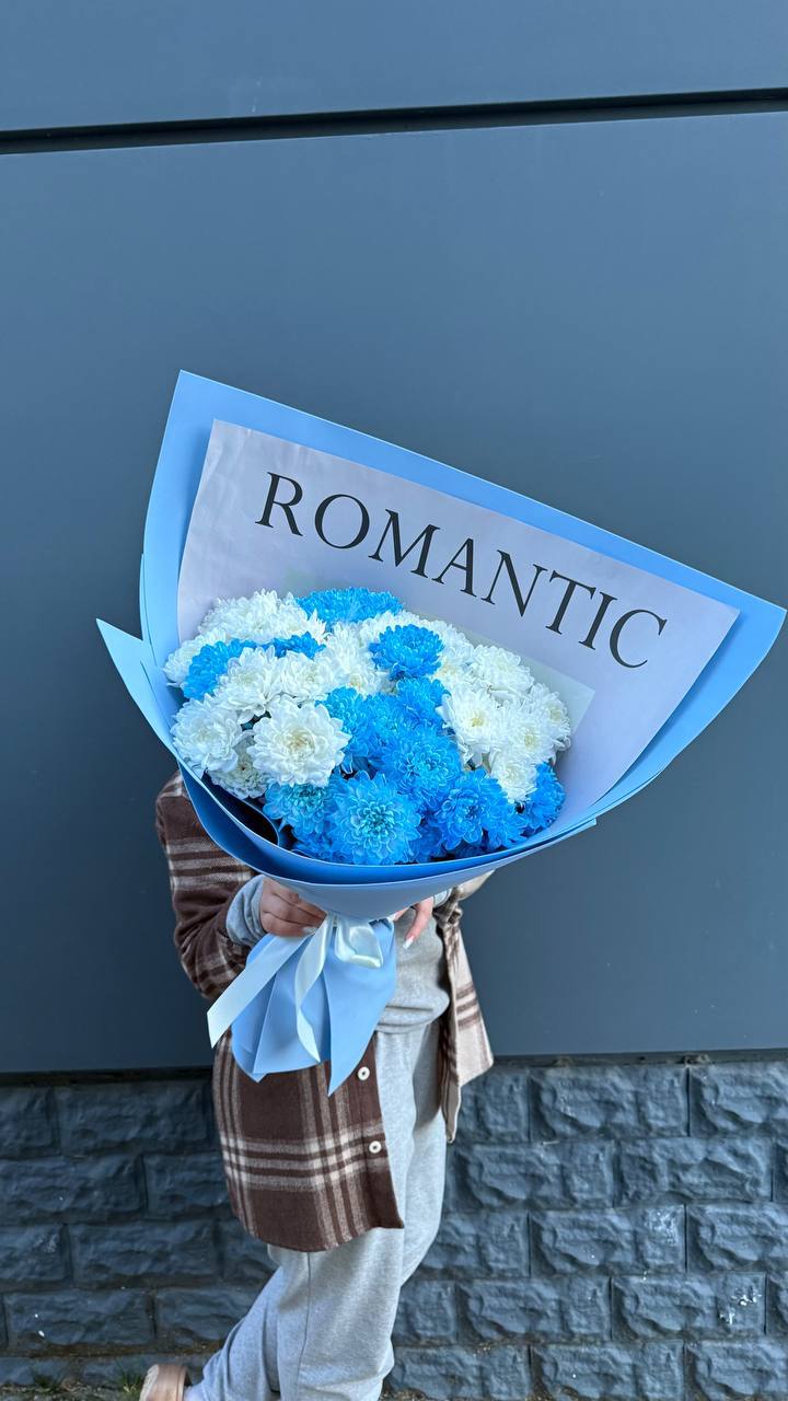 Контрастный микс из белоснежных и лазурных хризантем — идеальный способ сказать о самом важном. Лаконичный дизайн упаковки подчеркивает яркость цветов, а надпись Romantic говорит сама за себя. Подарите незабываемые эмоции и частичку нежности тому, кто вам дорог!