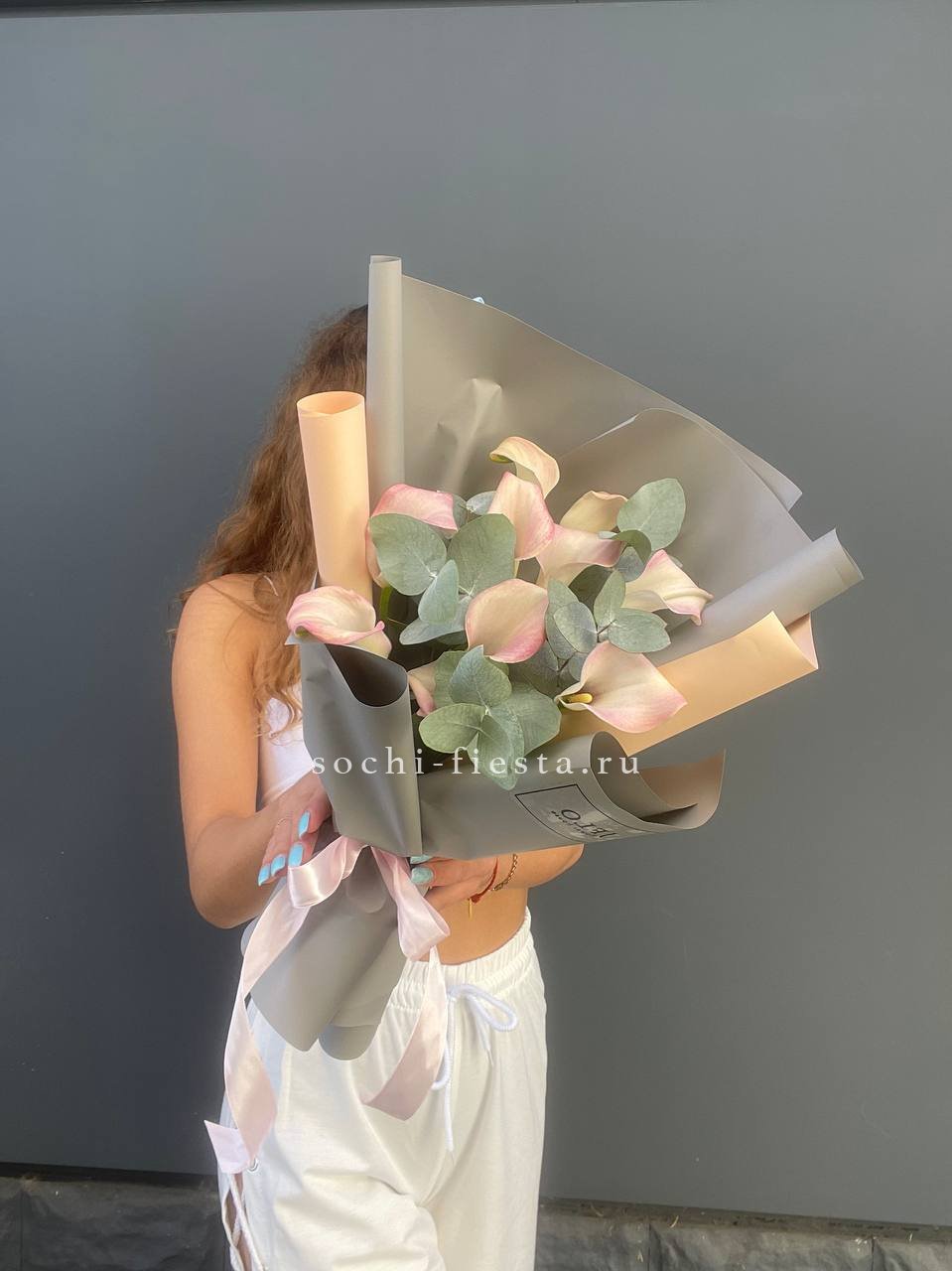 каллы - 9шт., декоративная зелень, лента.