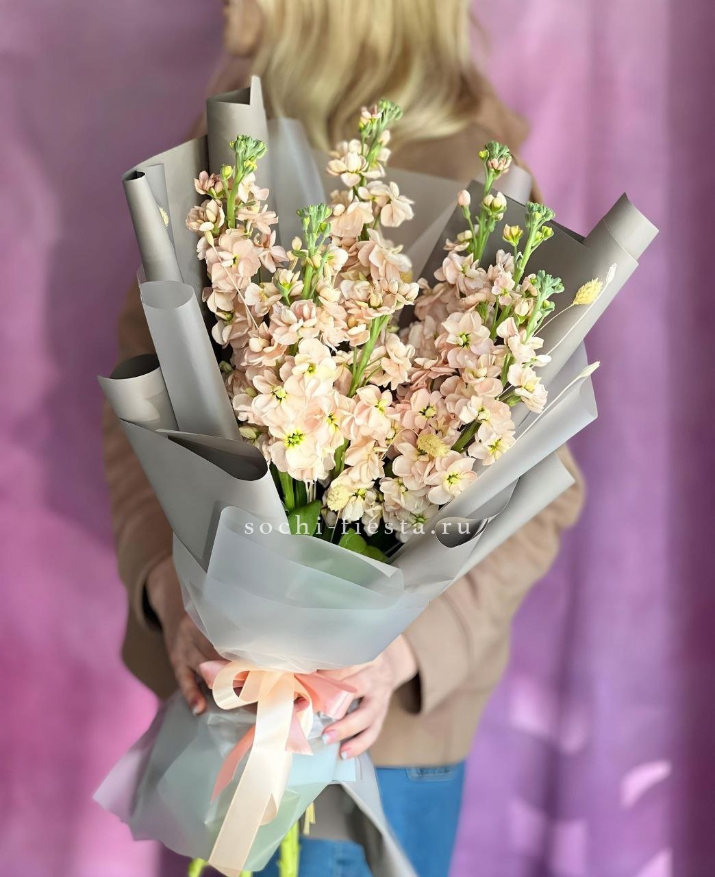 маттиола нежных тонов - 7 веток, лента, крафт или дизайнерская пленка.