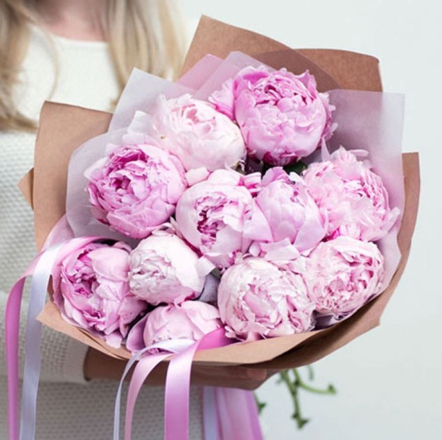 Одиннадцать розовых пионов собраны в плотный круглый силуэт. Крафтовая обёртка удерживает форму и придаёт букету графичность. Подходит для интерьеров в натуральной гамме.