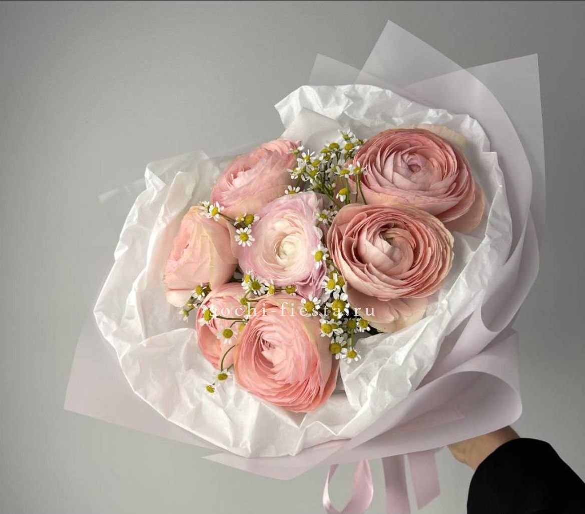 7 ранункулюсов, ромашка матрикария, лента, дизайнерская пленка комбинированная.