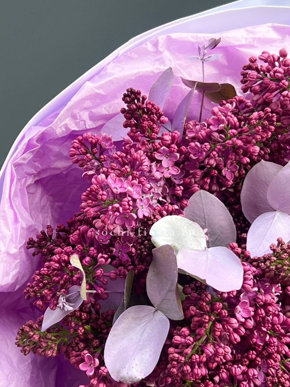Девять веток сирени образуют воздушную форму с мягким силуэтом. Соцветия располагаются свободно, создавая ритм без строгой геометрии. Композиция легко вписывается в любое пространство, сохраняя естественную красоту весеннего цветения.