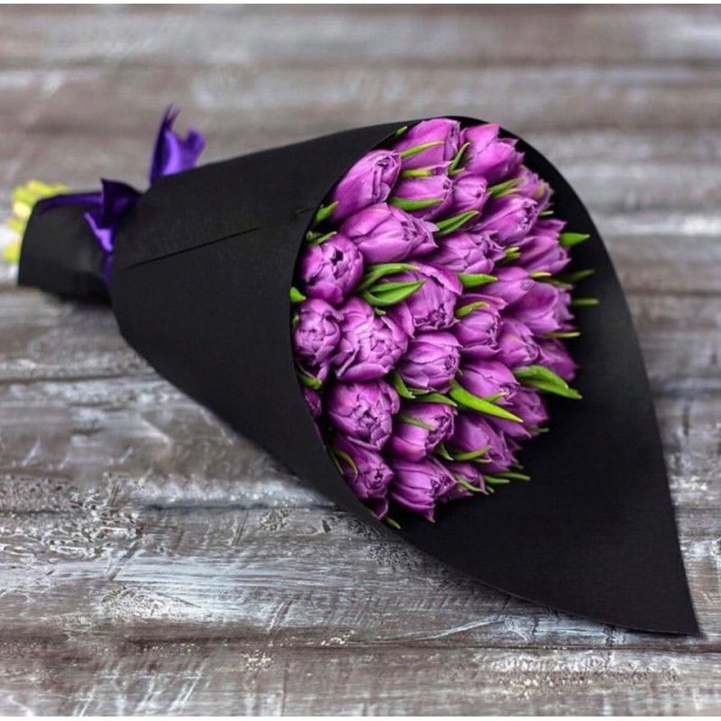 Тридцать три сиреневых пионовидных тюльпана собраны в плотный купол с махровыми лепестками. Черный крафт создает графичную рамку для насыщенного оттенка бутонов.