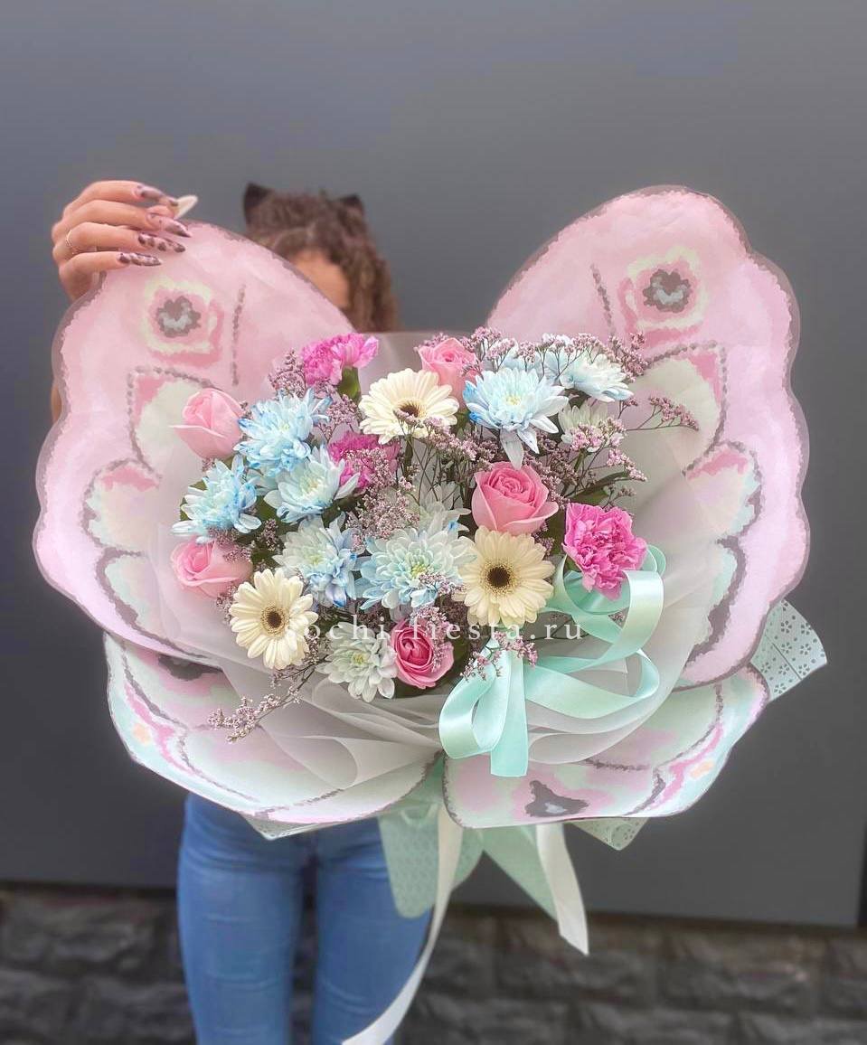 Голубые хризантемы встречаются с розовыми розами и герберами в свободной композиции. Лимониум добавляет воздушности, а декоративная бабочка завершает образ.