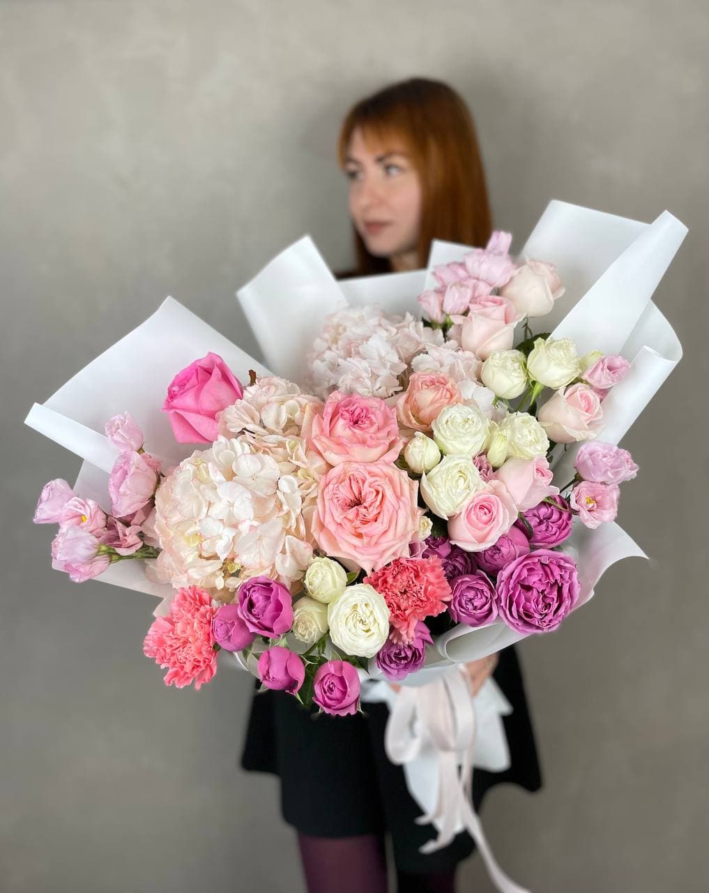 гортензия, розы одноголовые, кустовые розы, вероника (аналог вне сезона), маттиола (аналог вне сезона), эвкалипт, лента, дизайнерская упаковка.