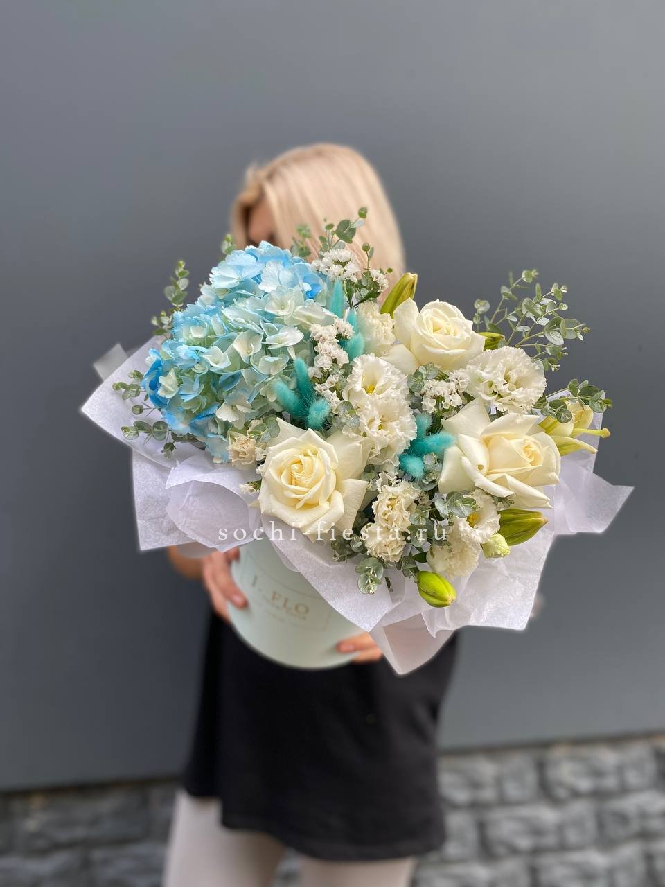 лилии, диантусы, статица, пионы или замена в не сезон эвкалипт, цилиндр.Состав может меняться в зависимости от сезона.