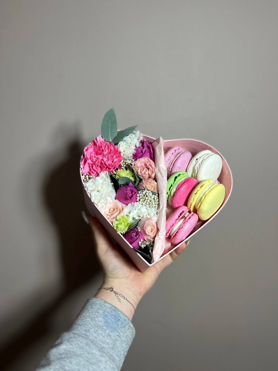 мисти баблс, бомбастик, эустома, эвкалипт, озатамус, макаронс, сердце коробочка.