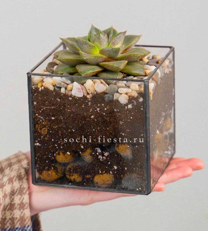 флорариум в кашпо Кубик идеален для подарка искушенным и практичным личностям. Растение неприхотливо в уходе, композиция стильно смотрится в любом пространстве:)