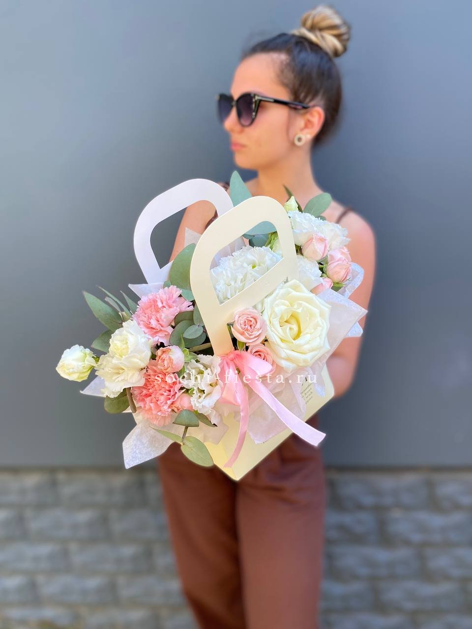 эустома, кустовые розы, белые розы, диантусы, лента, сумка-кашпо.