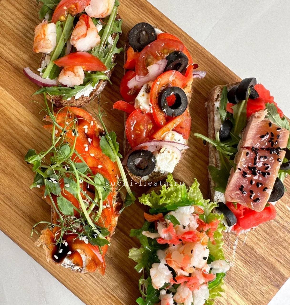 Пятнадцать брускет с разными начинками образуют яркую гастрономическую палитру. Греческие мотивы переплетаются с морскими акцентами, имбирный тунец дополняет свежесть рукколы и креветок.