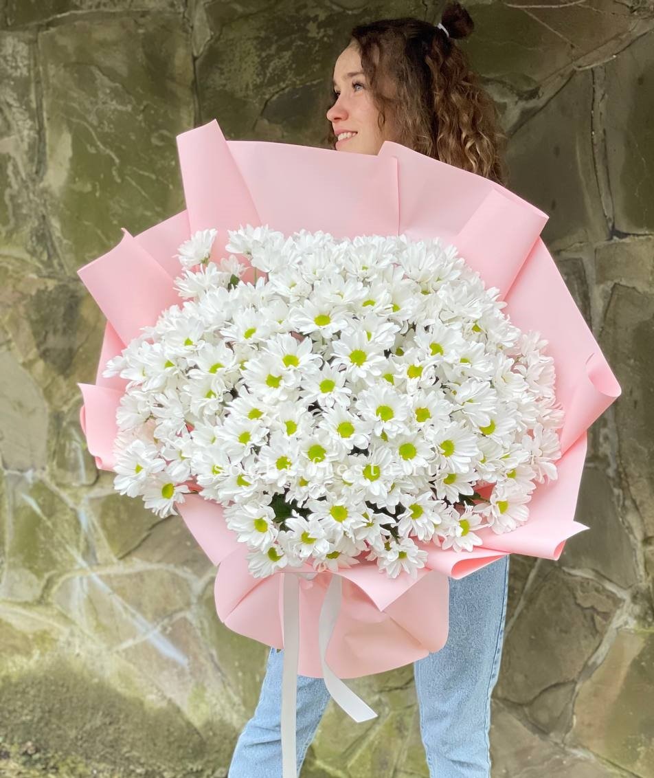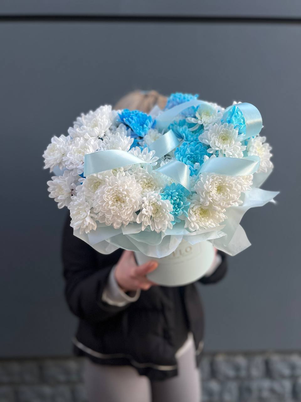 Яркие шапки хризантем собраны в компактной коробке с атласными лентами. Цветы держат форму и радуют свежестью несколько дней подряд. Удобный формат для размещения на столе или комоде.
