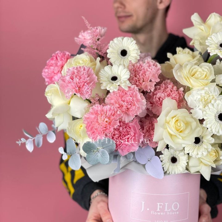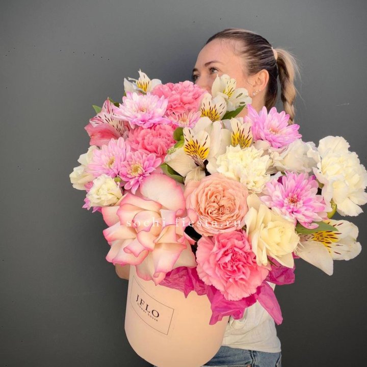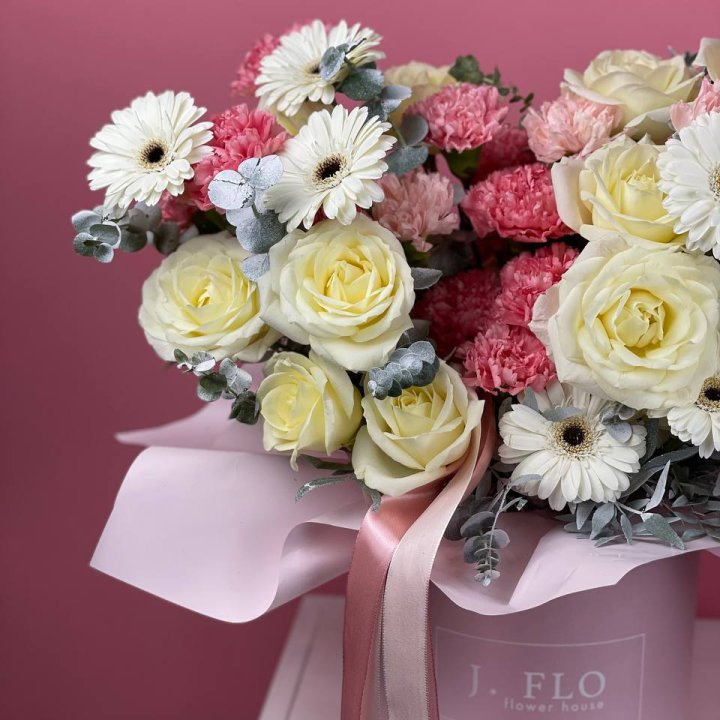 Шляпная коробка в омской флористике закрепилась как практичный формат. Композиция с флористической губкой, не требующая вазы, удобная для офиса и квартиры. Для бизнес-центров на Маркса, Ленина, Красного Пути — устойчивый стандарт корпоративных подарков.