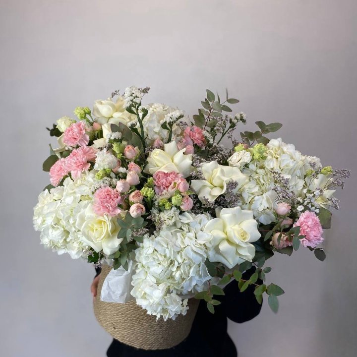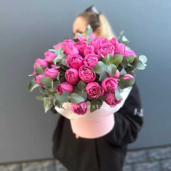 Наполнение подбирается под сезон и сибирскую логистику. Зимой — амариллис, плотные розы Red Naomi, ранункулюсы. Весной — тюльпаны и ранункулюсы. Летом — пионы в июне (короткий сезон), гортензия в июле-августе. Осенью — хризантемы и декоративные травы.