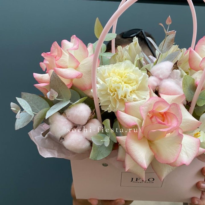 Коробка — плотный картон с матовой поверхностью. Внутри — флористическая губка, пропитанная водой. Сверху — атласная лента, декоративная тесьма.