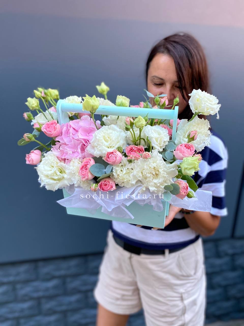 лилии, французские розы, гортензия, альстромерия, статица,деревянный ящик.