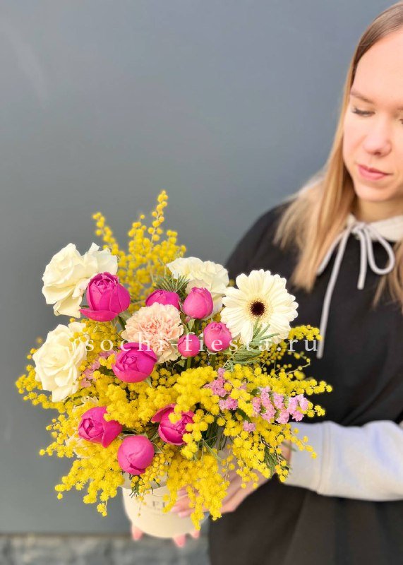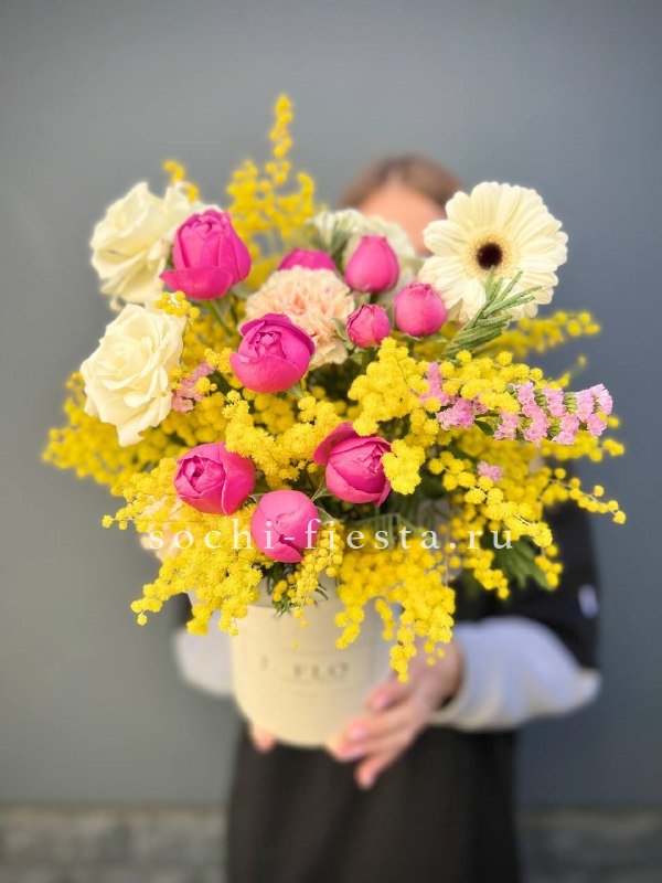 Яркая мимоза задает солнечный ритм всей композиции. Пионовидные розы и герберы создают плотную текстуру, а диантусы с статицей добавляют воздушную легкость.