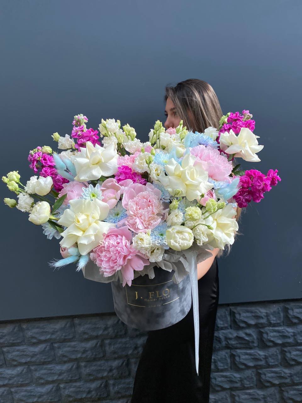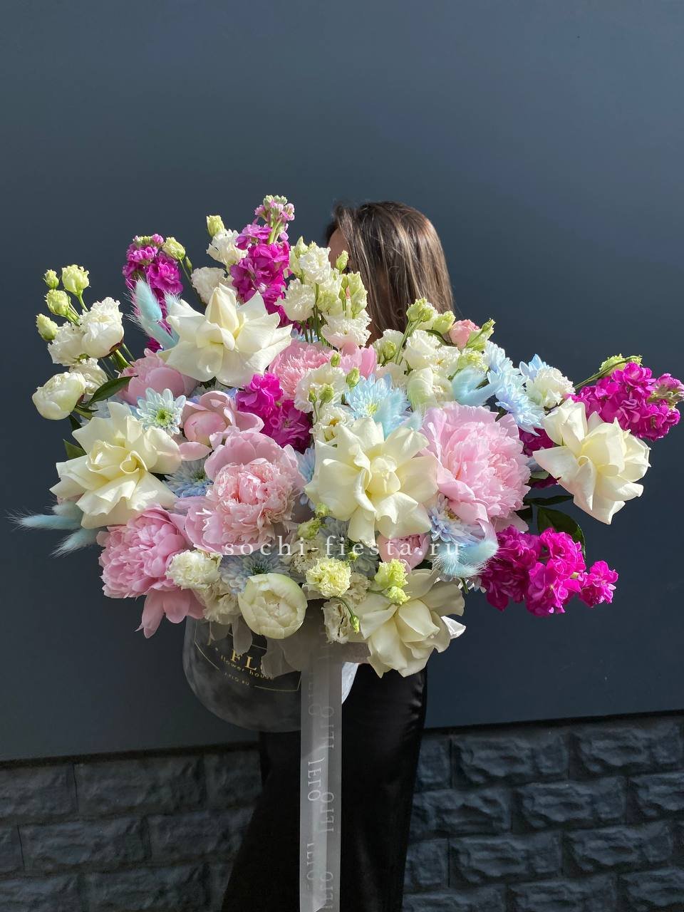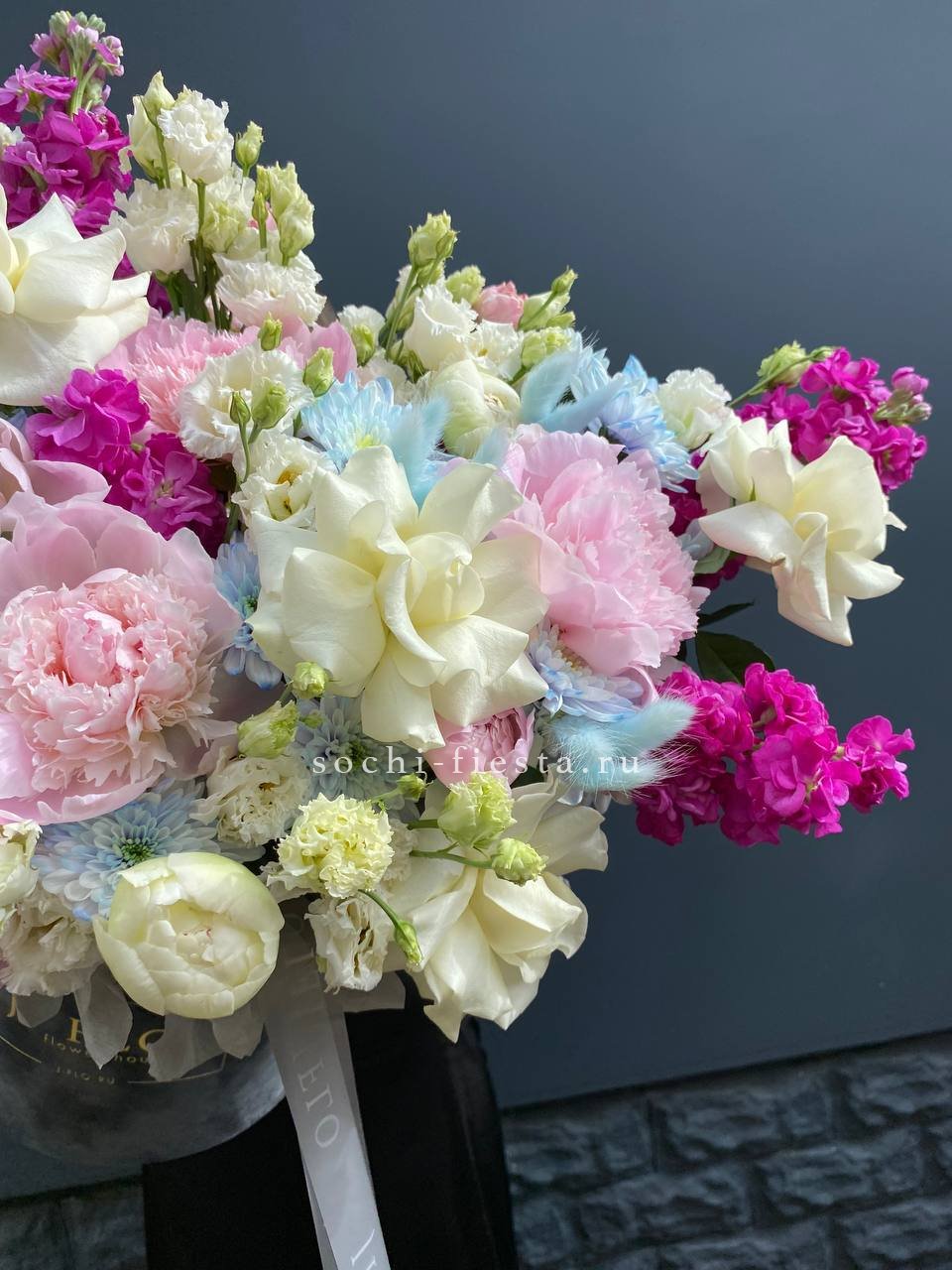 Белоснежные розы и эустома переплетаются с пушистыми соцветиями маттиолы и пионами в бархатном цилиндре. Лагурус добавляет воздушности, а весь образ создаёт ощущение летнего сада в доме.