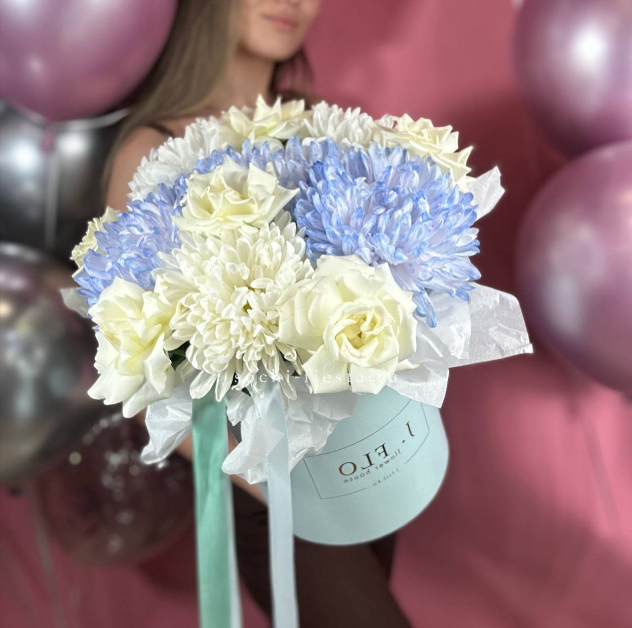 вывернутые белые розы, одноголовые хризантемы, цилиндр D20, лента.