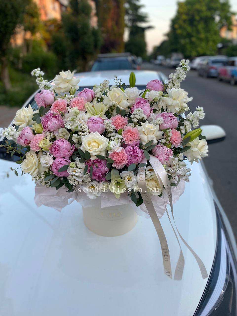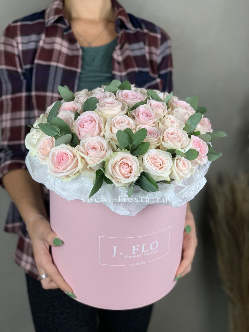 Пионовидные кустовые розы формируют плотный купол с мягкими переходами оттенков. Каждый бутон раскрывается слоями, создавая объёмную текстуру. Эвкалипт добавляет свежести композиции в цилиндре.