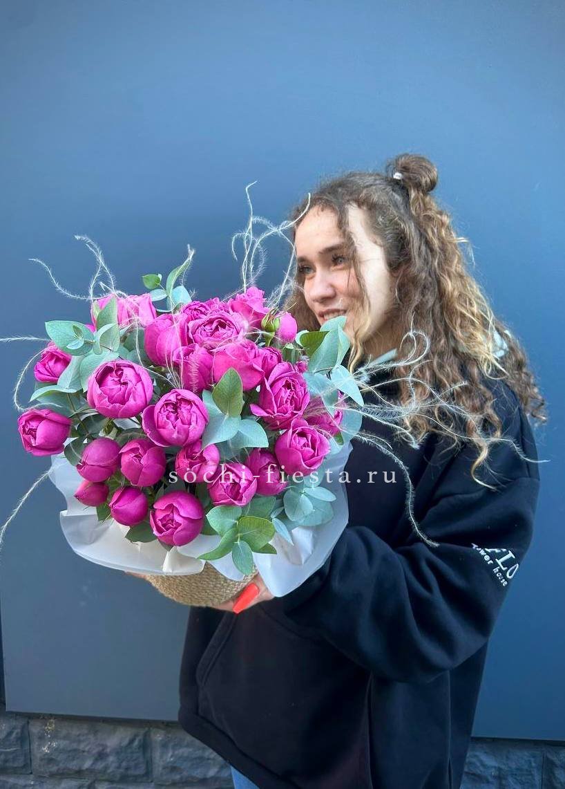 Для заказа товара "Пионовидные розы в джутовом кашпо " с доставкой в Омске нажмите в корзину