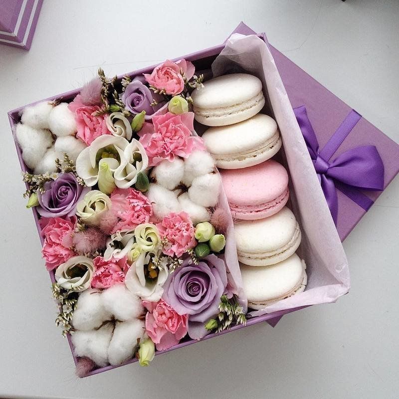 Композиция в квадратной коробке объединяет воздушный хлопок и яркие диантусы с пятью французскими макаронс. Компактная форма удобна для размещения на столе или полке. Готовое решение для приятного сюрприза.