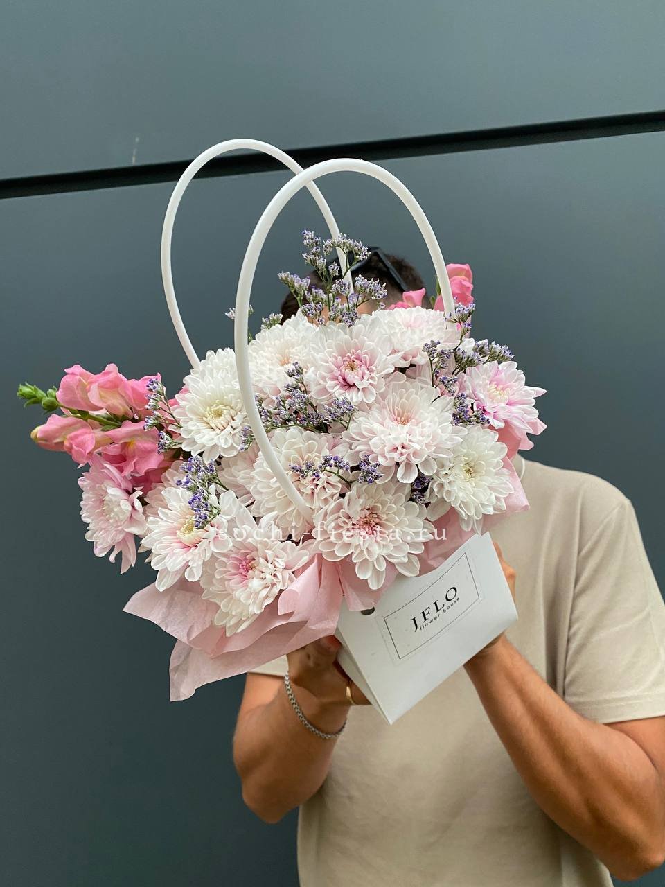 Хризантемы и львиный зев собраны в удобную сумочку с плотной структурой. Лимониум добавляет воздушности между яркими соцветиями. Композиция сохраняет свежесть долго и не требует особого ухода.