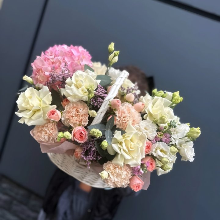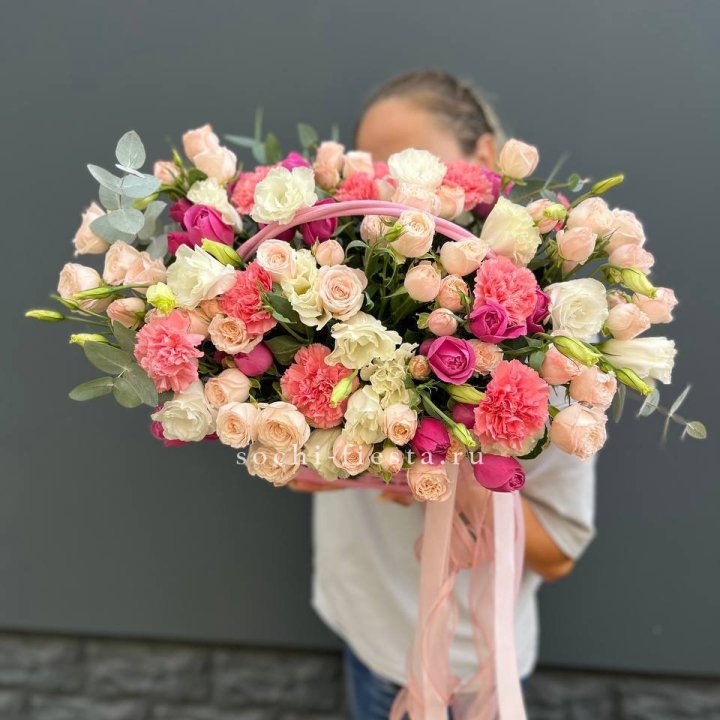 Состав омских корзин охватывает весь диапазон запросов. Розы Freedom, Mondial, Cappuccino — для классических торжественных аранжировок. Пионы в сезон — главный летний продукт. Хризантема кустовая, альстромерия — для объёмных корпоративных наполнений. Эустома, ранункули — для садового стиля. Хвойные ветви, амариллис, хлопок — для зимних аранжировок. Флорист создаёт корзину под задачу и сезон.