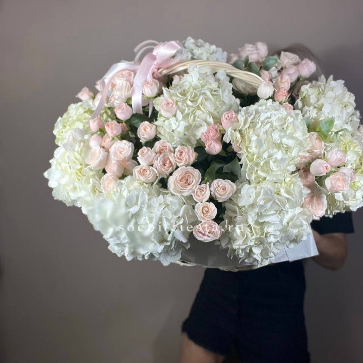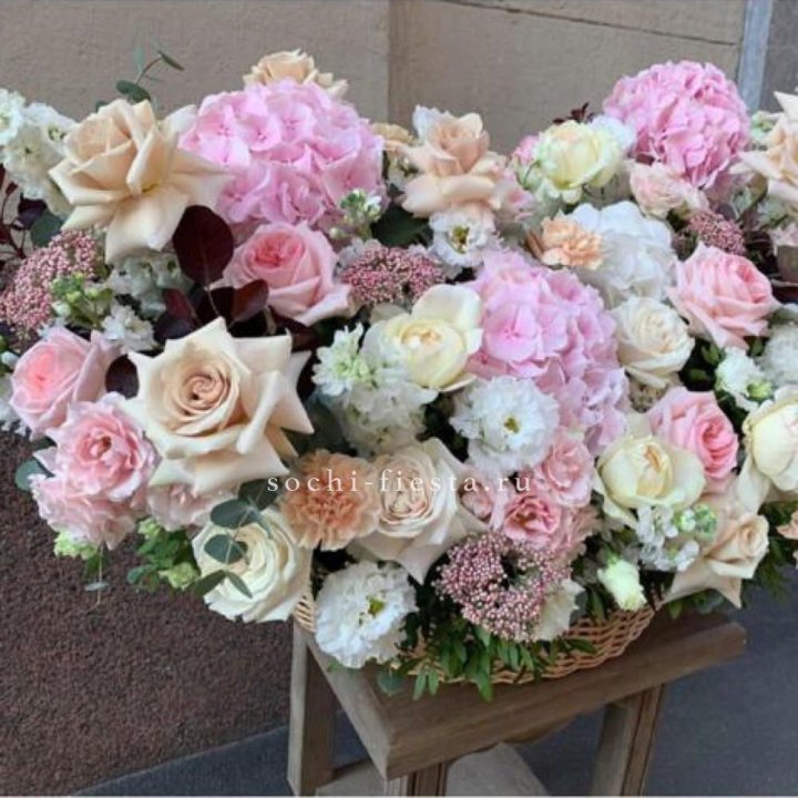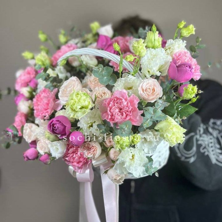 Состав омских корзин охватывает весь диапазон запросов. Розы Freedom, Mondial, Cappuccino — для классических торжественных аранжировок. Пионы в сезон — главный летний продукт. Хризантема кустовая, альстромерия — для объёмных корпоративных наполнений. Эустома, ранункули — для садового стиля. Хвойные ветви, амариллис, хлопок — для зимних аранжировок. Флорист создаёт корзину под задачу и сезон.